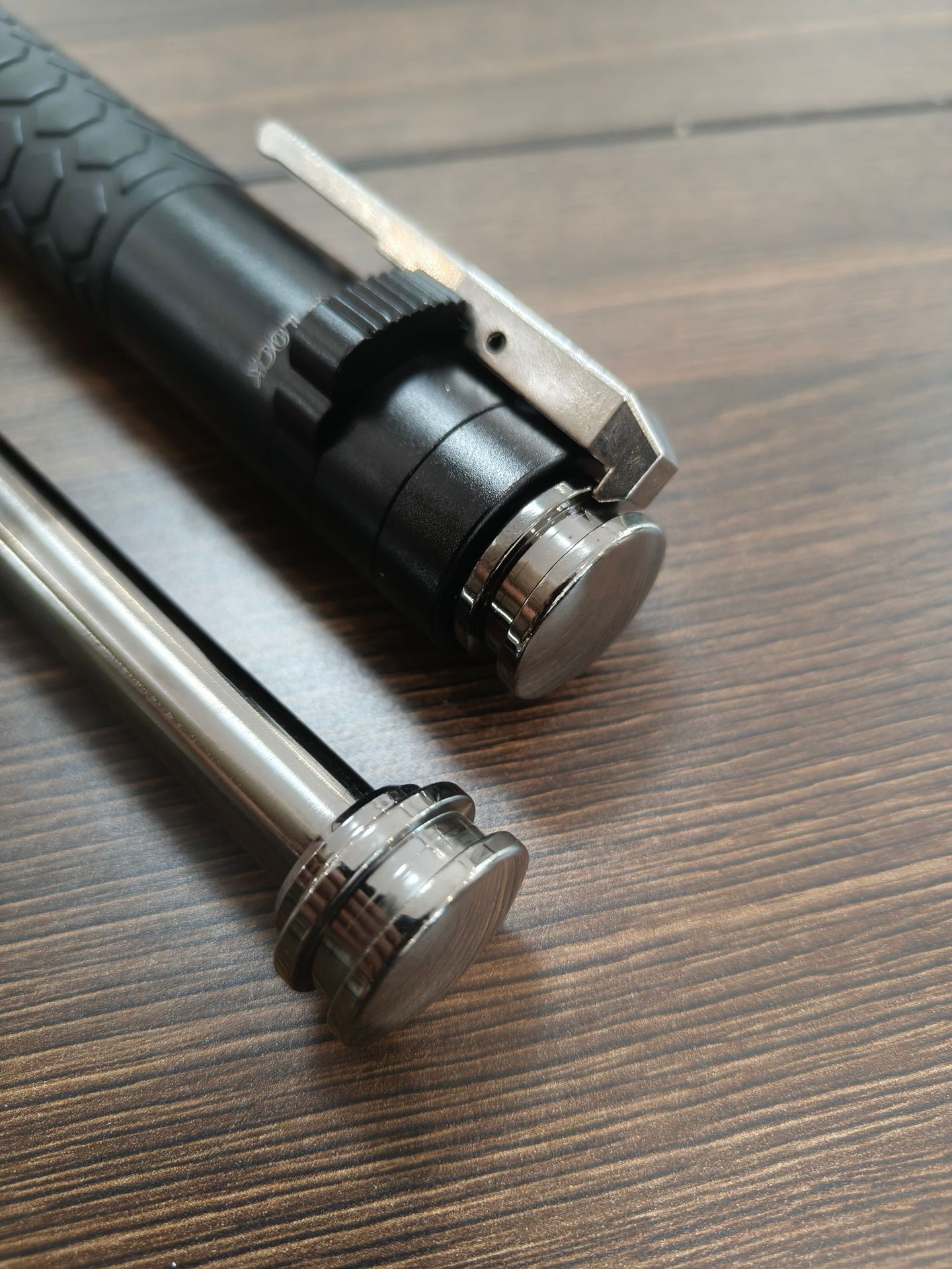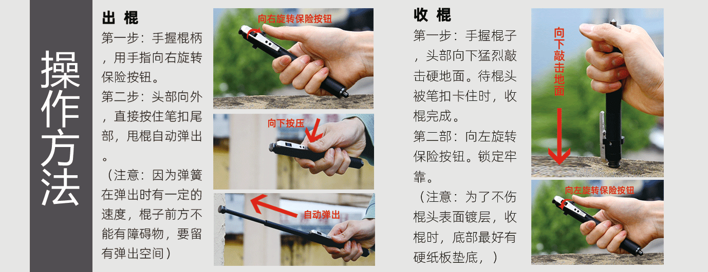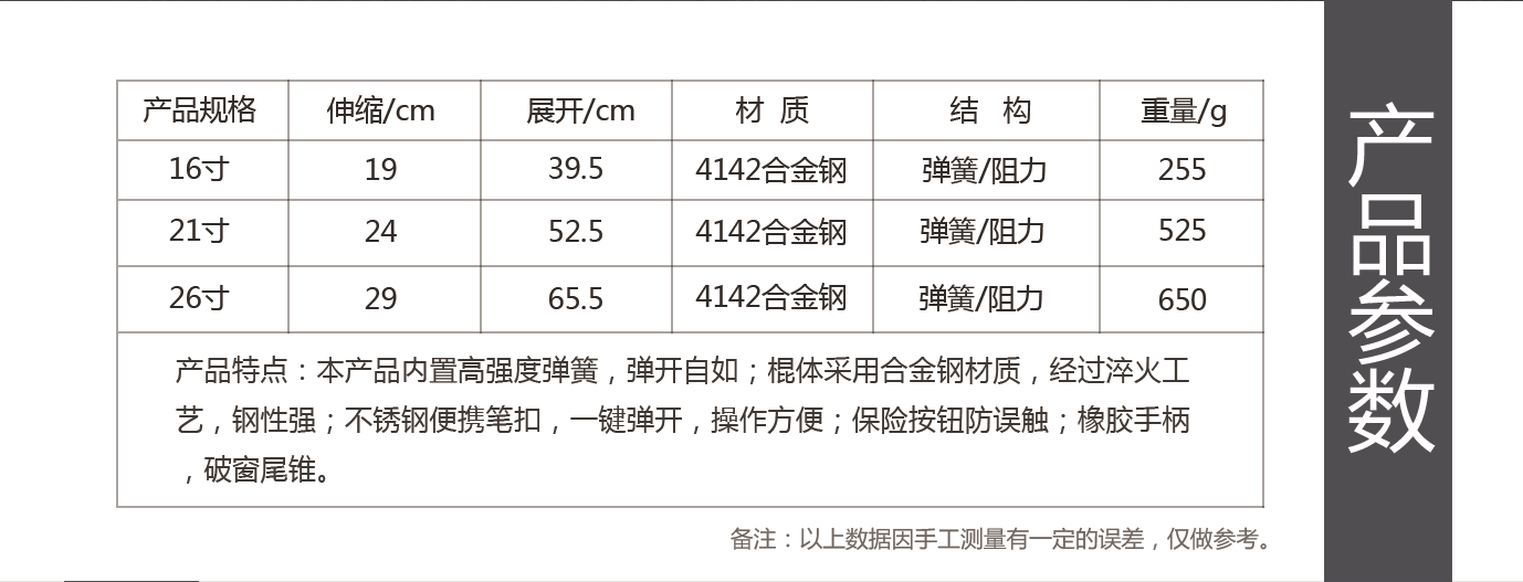 产品特点:全钢材质淬火工艺,不锈钢便携笔扣,一键弹开,锁定