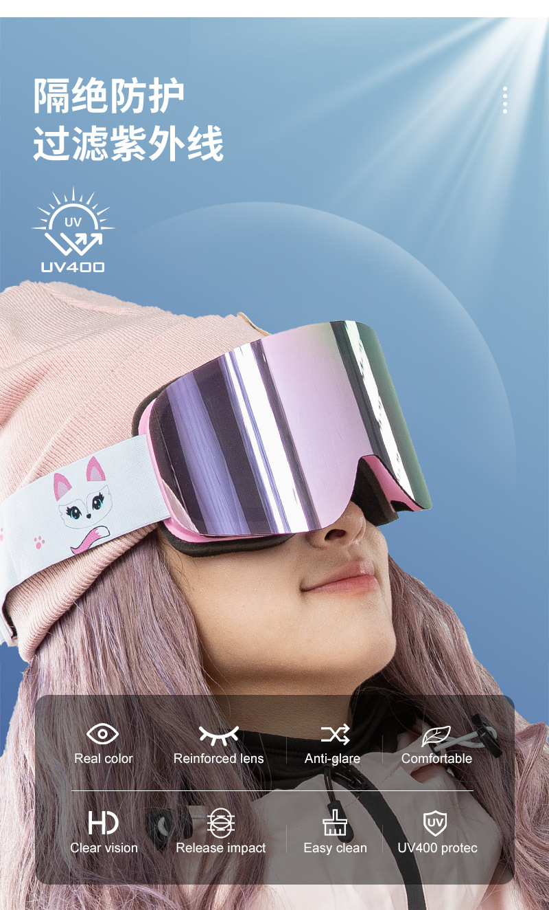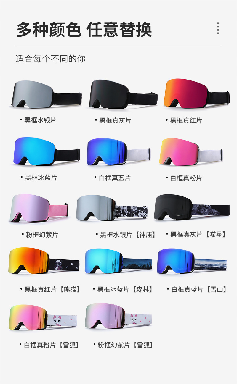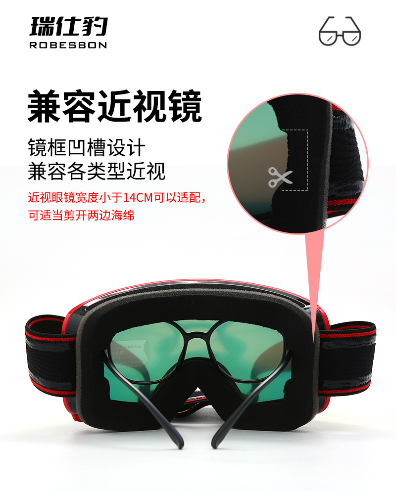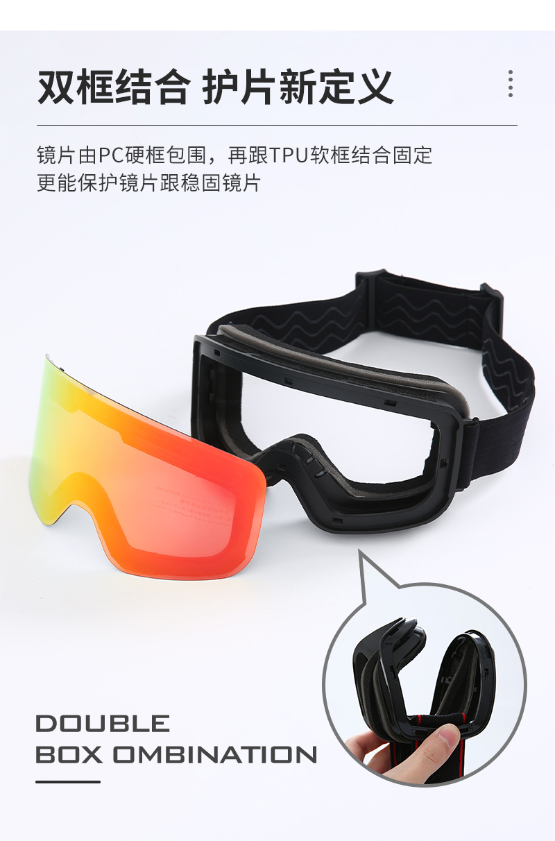 1、TPU软框,全面REVO镀膜PC片,意大利双层防雾片,三层海绵,滴胶双面绒松紧带。