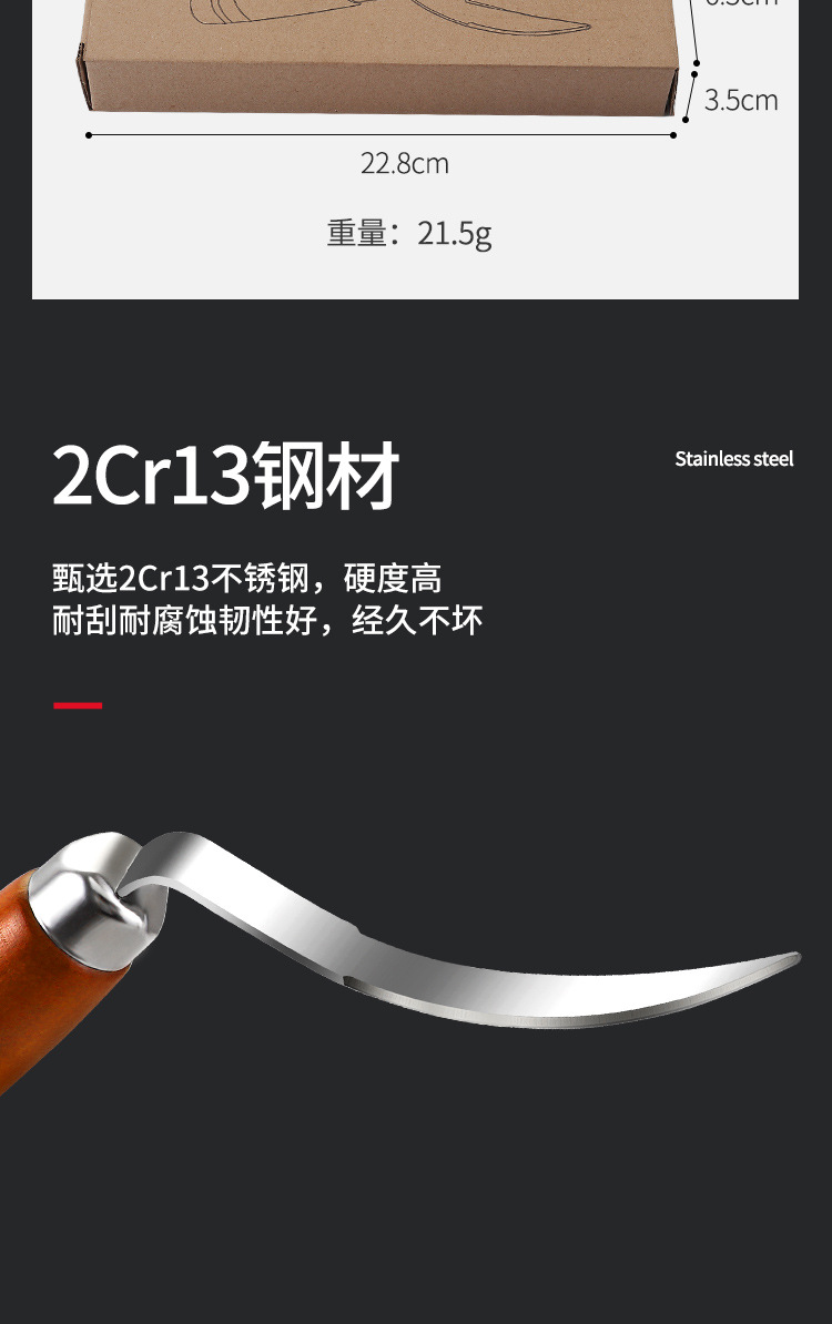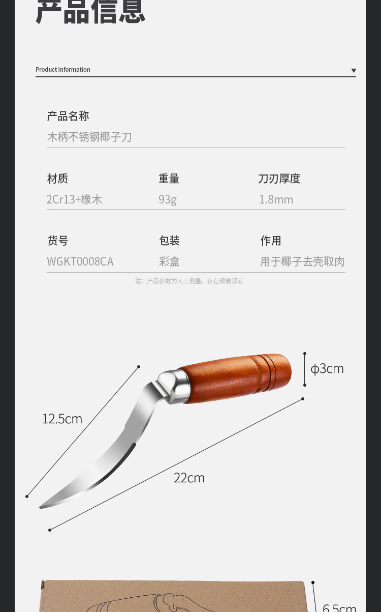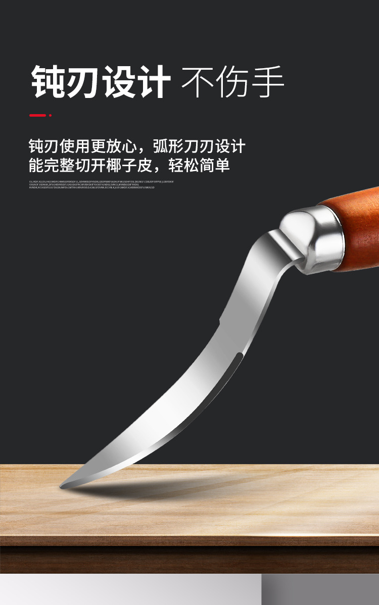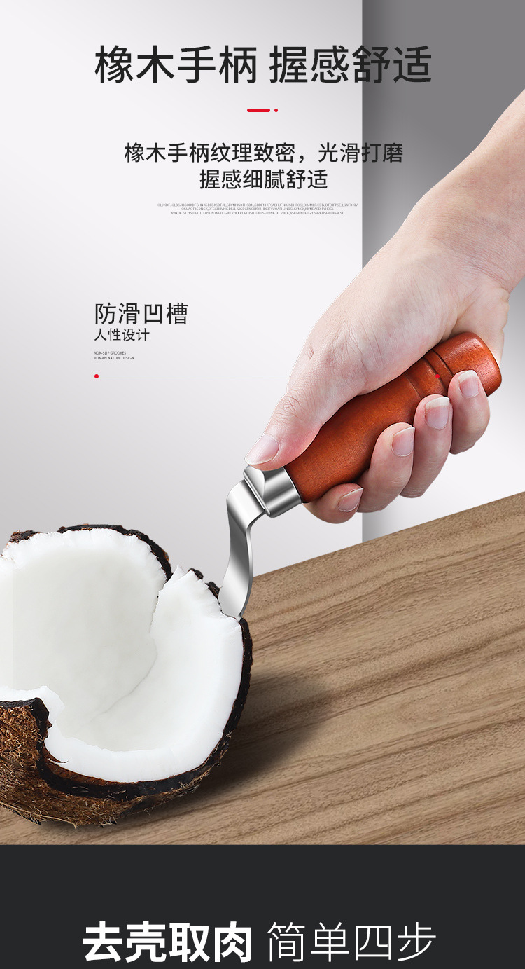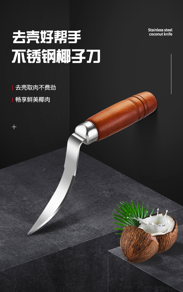 Прямые поставки с завода, совок для кокосового мяса из нержавеющей стали с изогнутым лезвием, разделитель кокосового мяса с заостренной деревянной ручкой