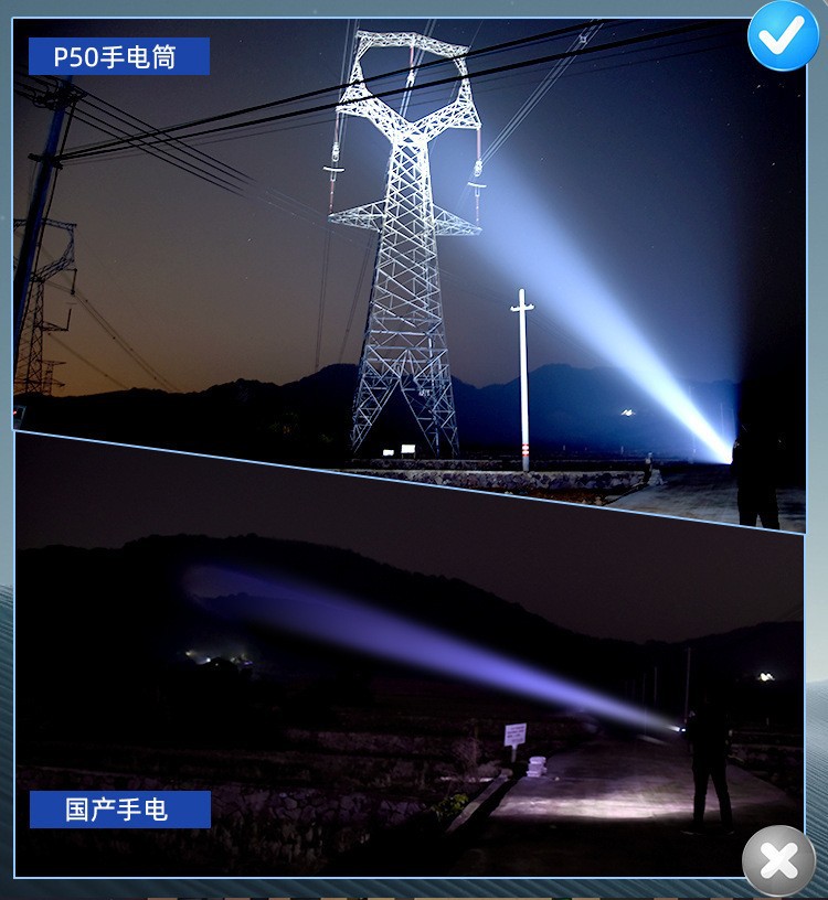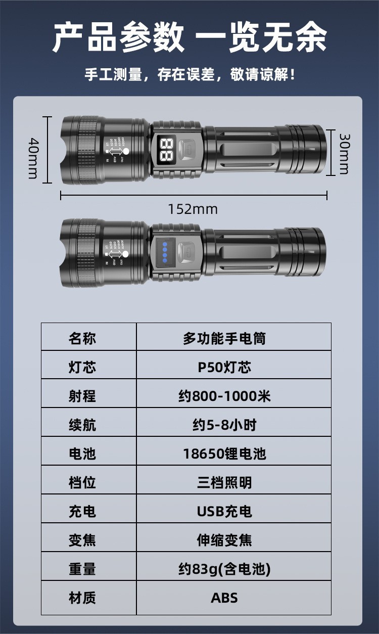 Перезаряжаемый фонарь Cross-Border P50 с ярким светом, телескопическим зумом, цифровым электродисплеем, портативный, с длительным временем работы от батареи