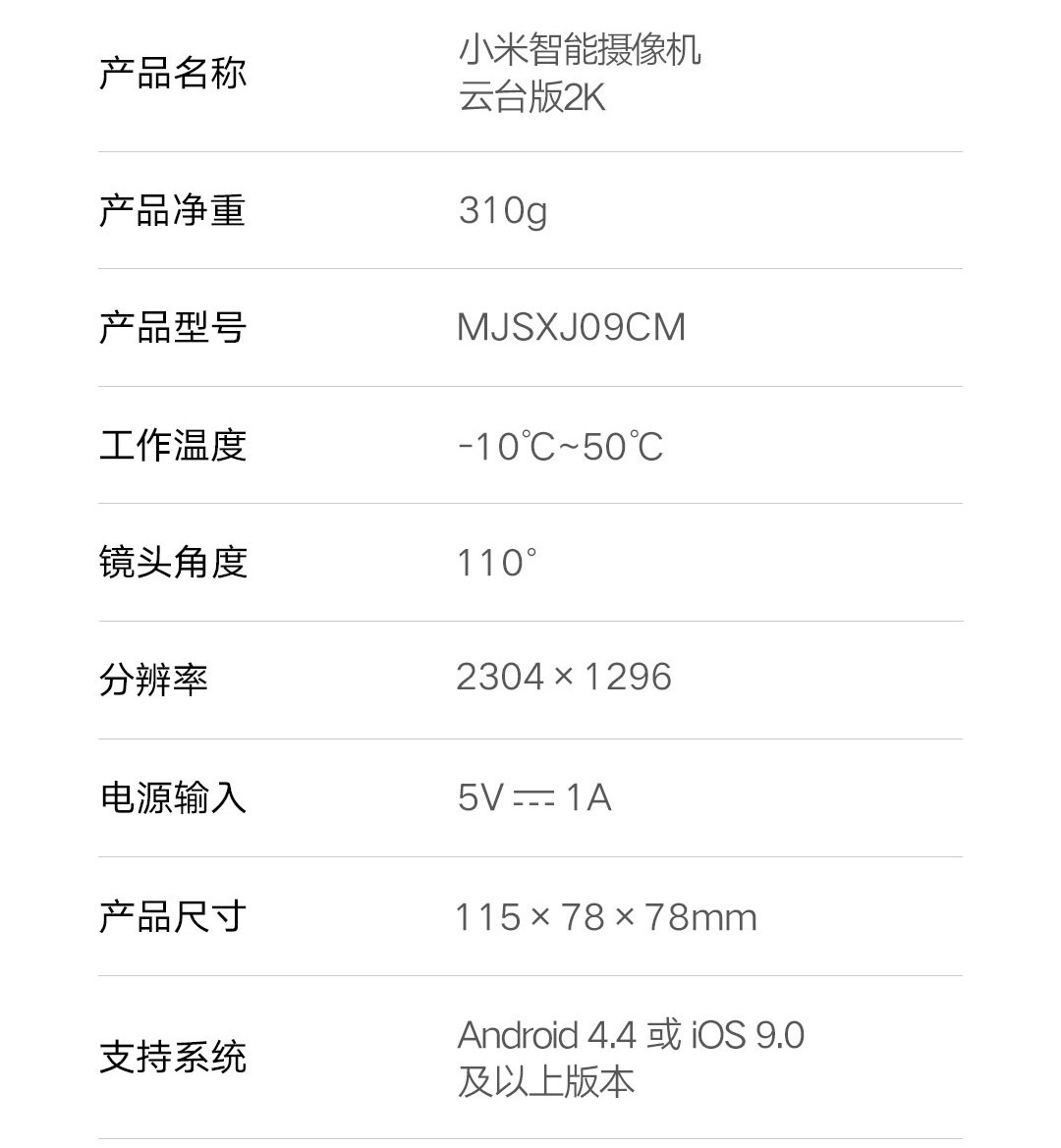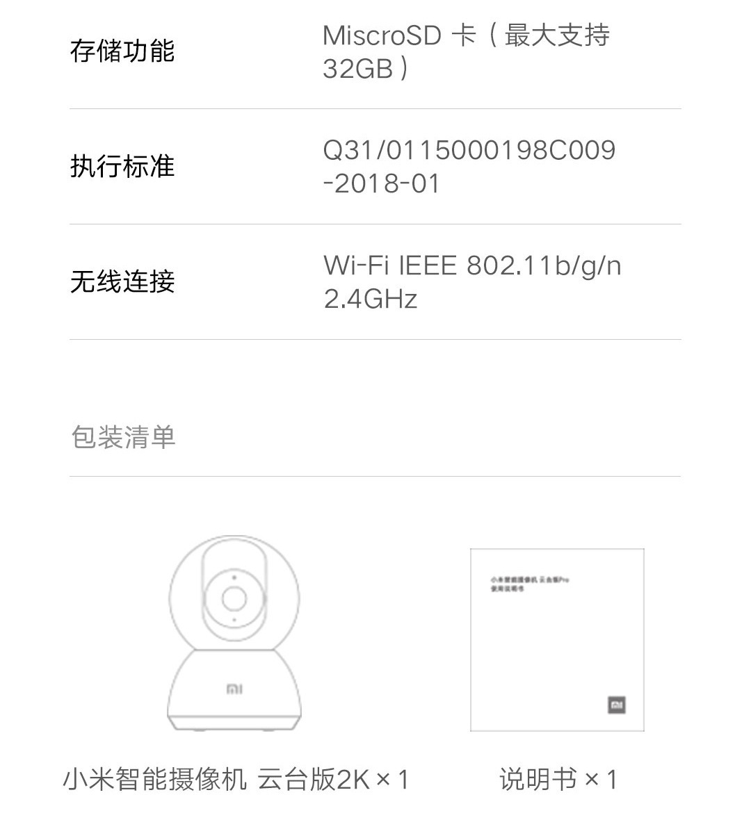 Список упаковки Xiao mi smart camera ptz version 2k*1 manual*1 power adapter*1 power cable*1 wall mounting accessory pack*1