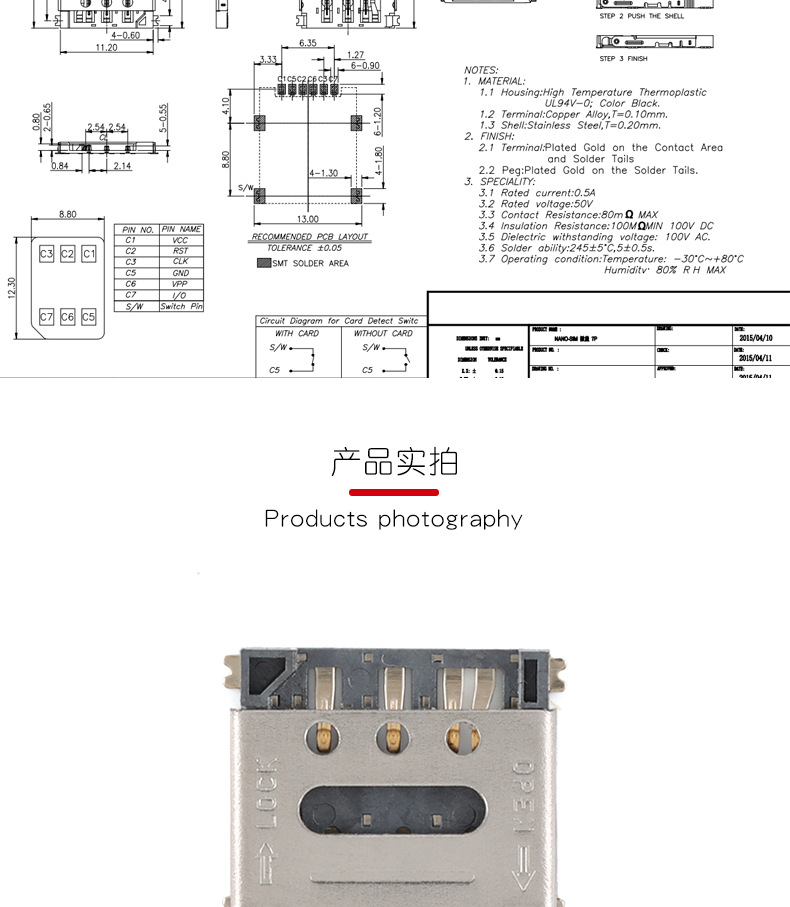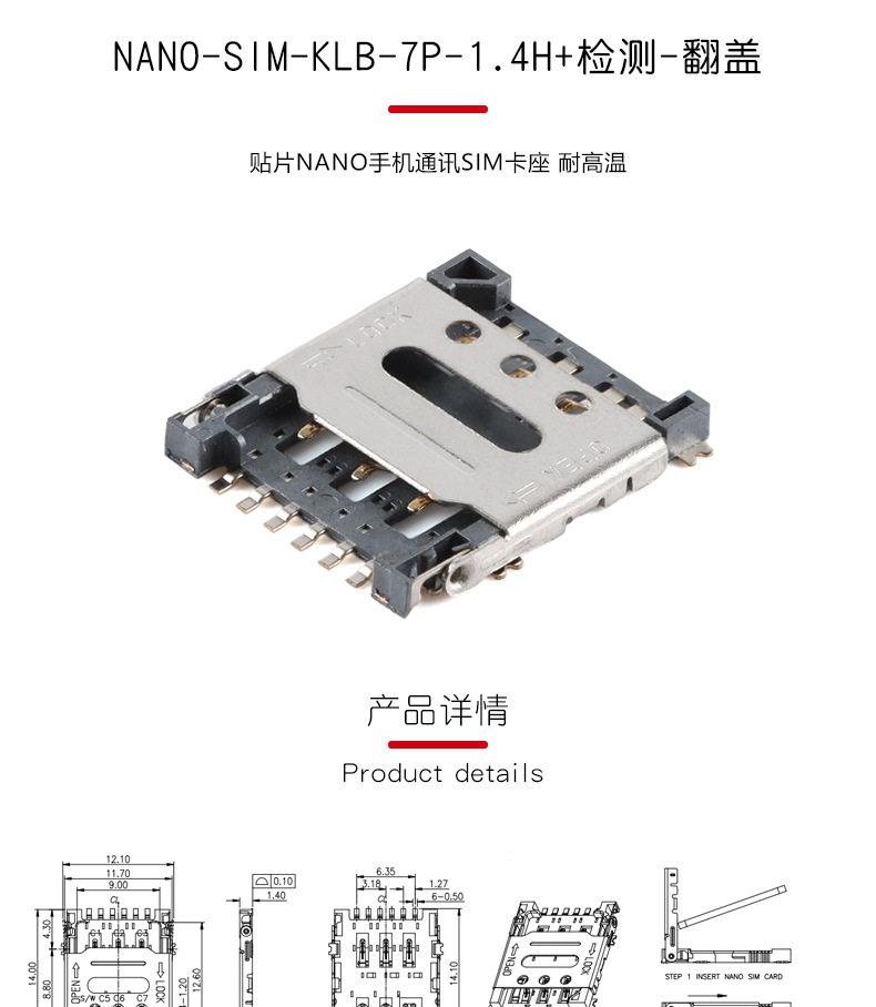 Нано-сим-картодержатель Klb-7P-1.4H+ с детекцией для мобильного телефона