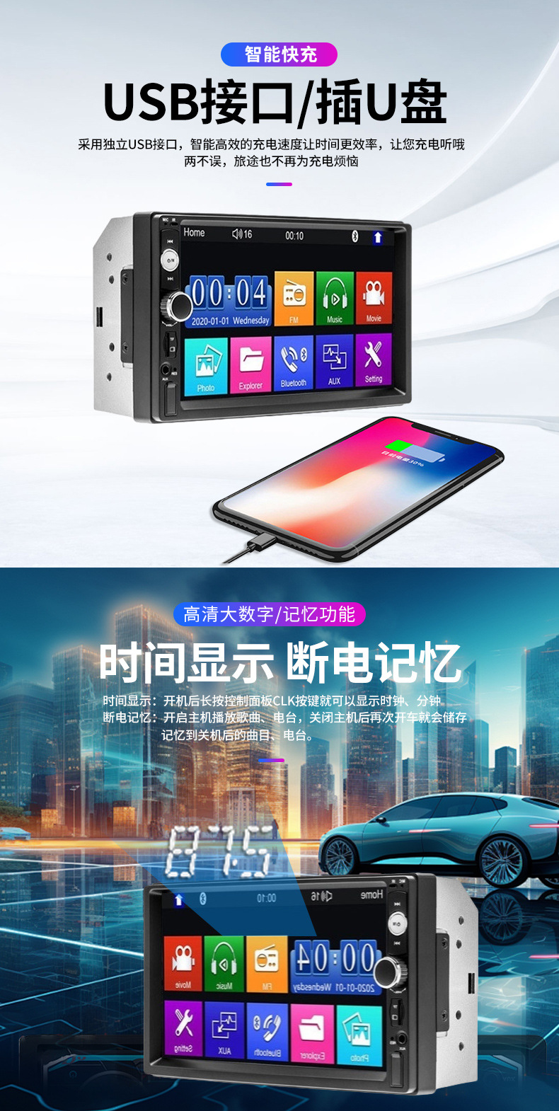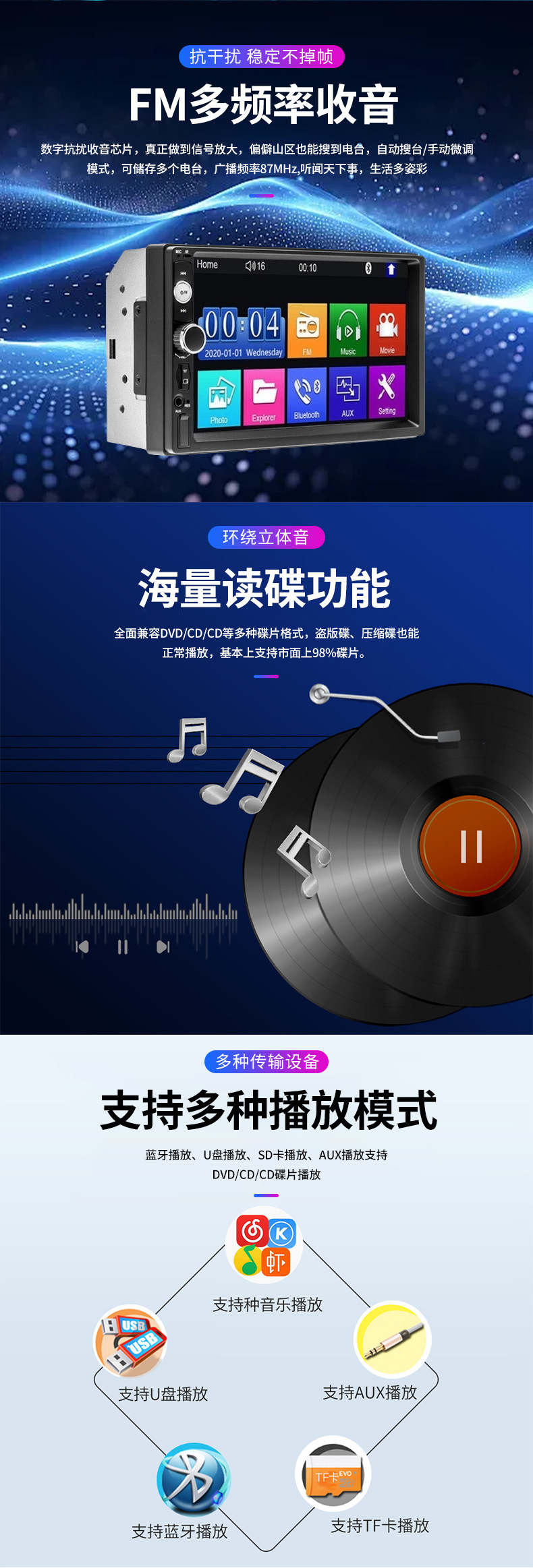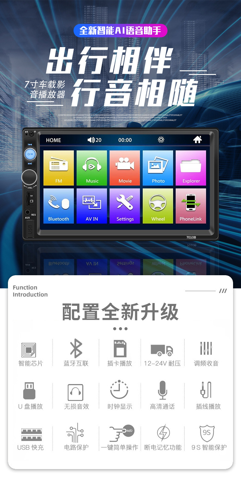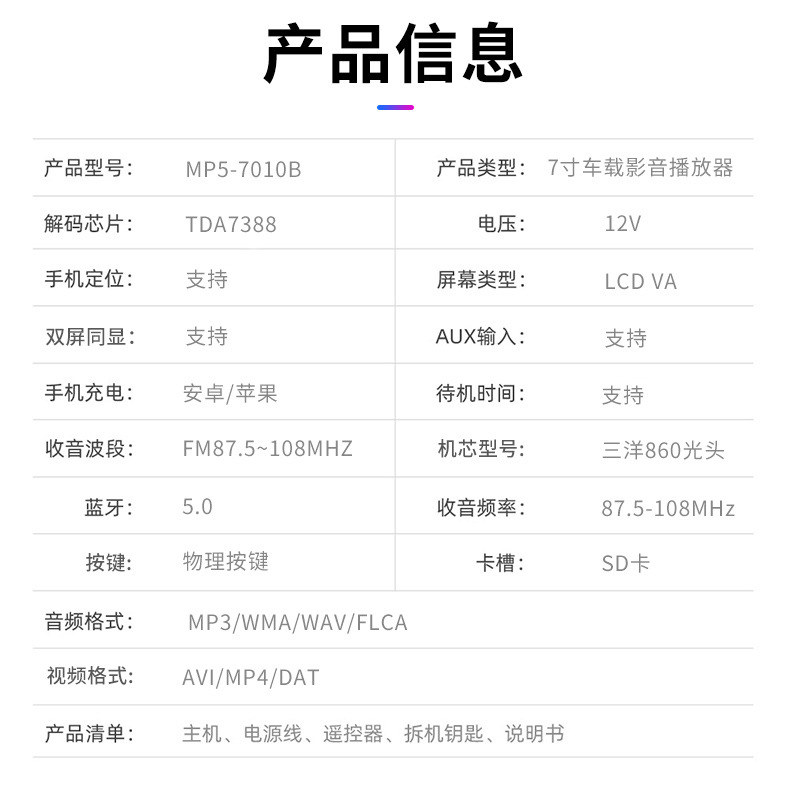 7-дюймовая магнитола MP5, MP3 плеер 7010B, слот для карты, USB, радио, Bluetooth, hands-free, задний ход