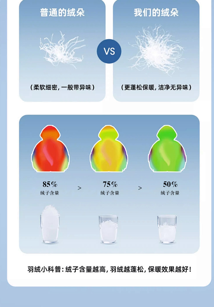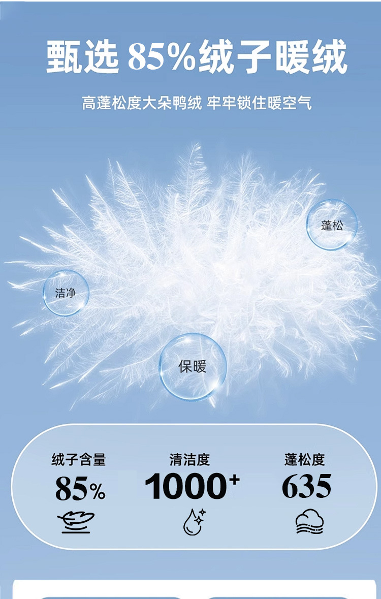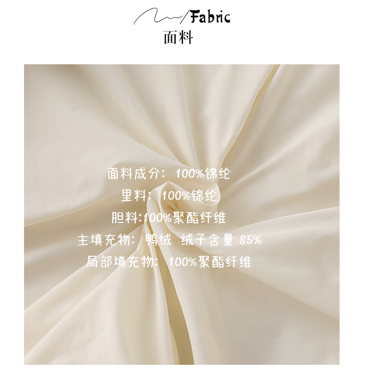 主填充物:鸭绒 绒子含量 85% 局部填充物:100%聚酯纤维