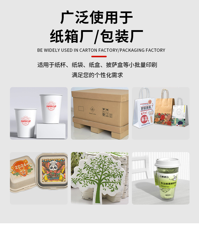 无版数码印刷机可在木板、纸杯、纸袋、纸盒上直接印刷各种图案、文字、logo。