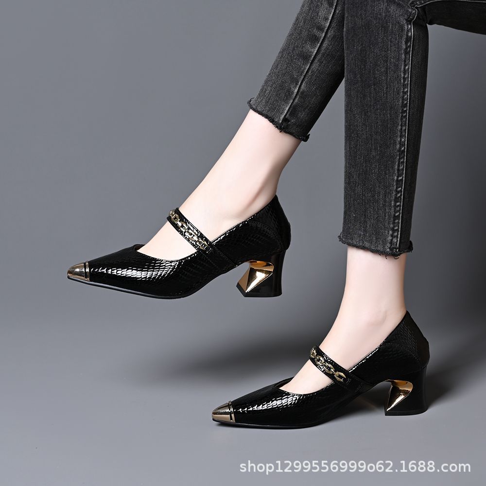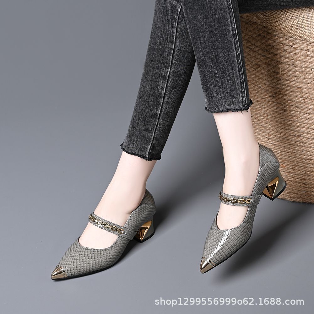 Толстые каблуки женские туфли 2025 весна и осень новые острые носки с открытым носком металлическая цепочка универсальные удобные неутомительные мюли