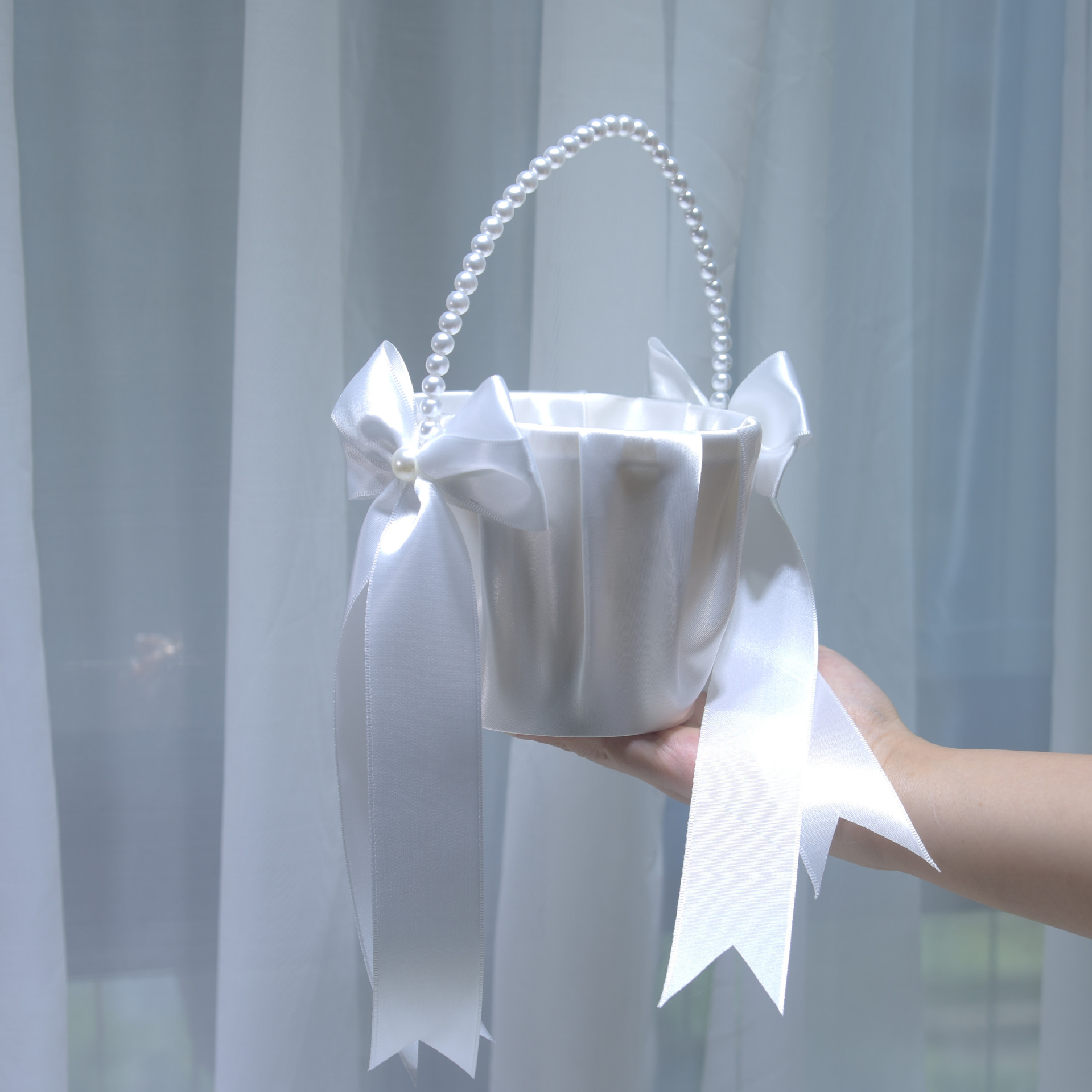 Белая корзина для цветов для девочки, атласная с жемчужным узлом, отправка в считанные секунды