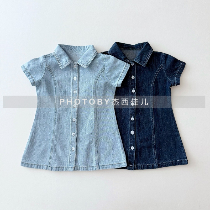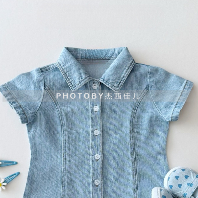 Джинсовое платье для девочек, новое летнее, модное, с отложным воротником, короткий рукав, корейский стиль, юбка А-силуэта