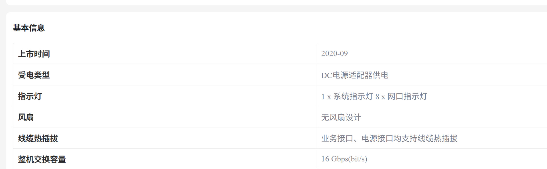 8 x 网口指示灯 风扇 无风扇设计 线缆热插拔 业务接口、电源接口均支持线缆热插拔 整机交换容量 16 Gbps(bit/s) 整机包转发率 12 Mpps MAC表容量 4K 产品重量 0.19kg(不含包材) 产品尺寸(宽x深x高) 144mm x 85mm x 23mm 散热方式 自然散热 电源输入 DC电源适配器供电: