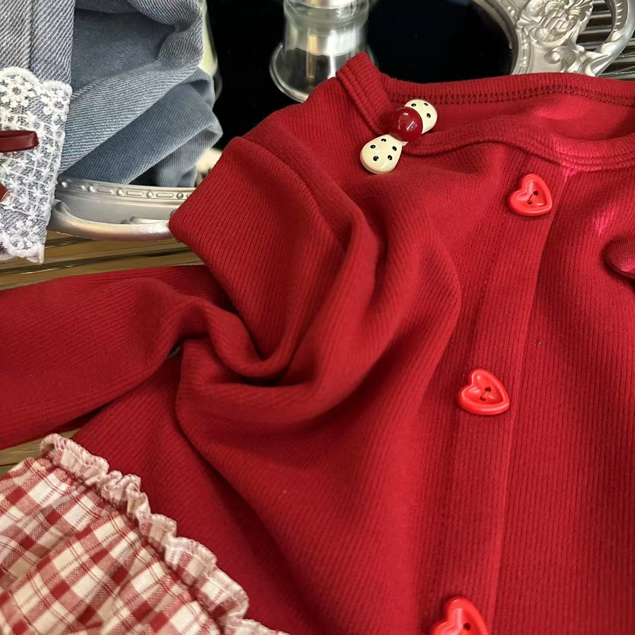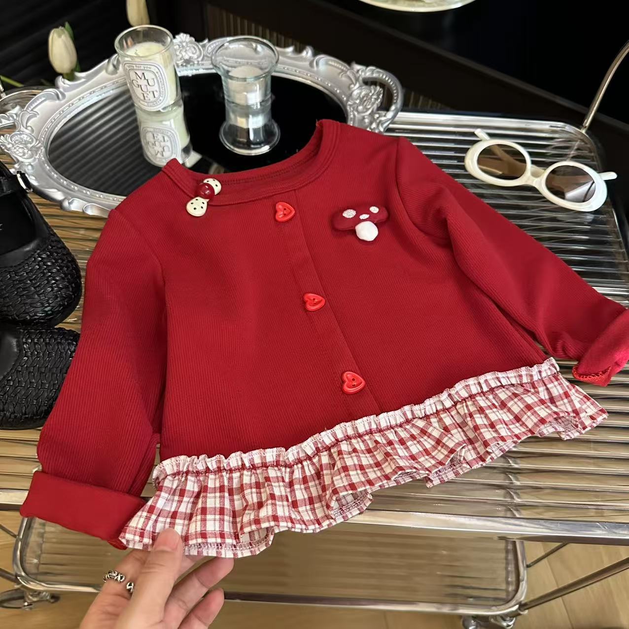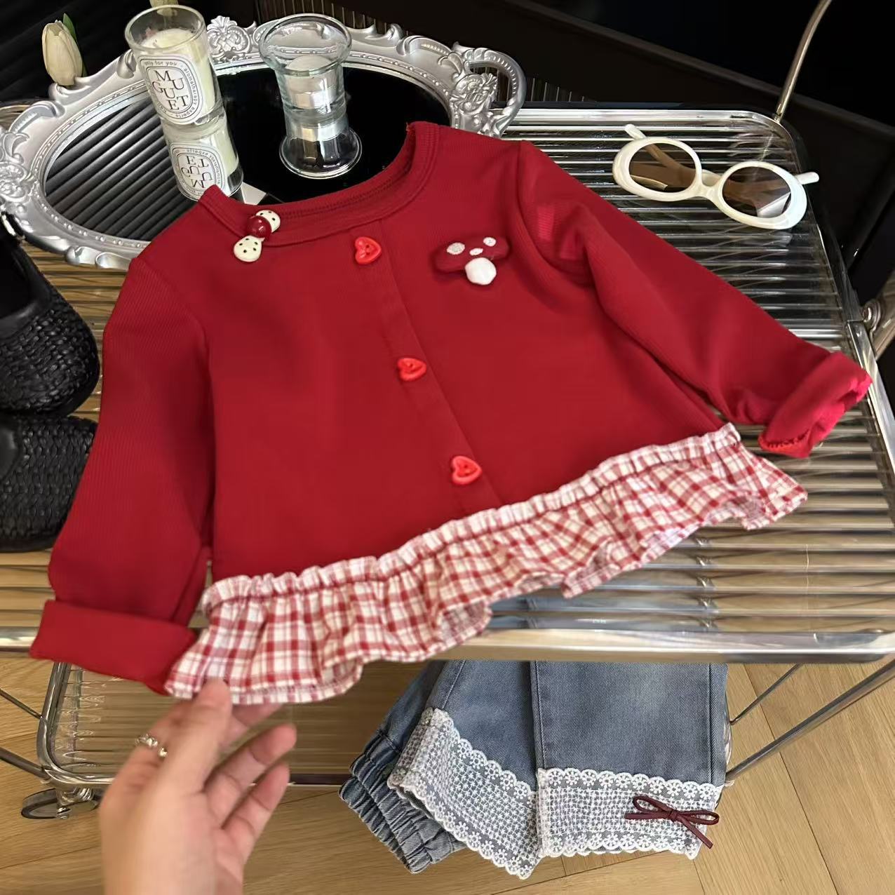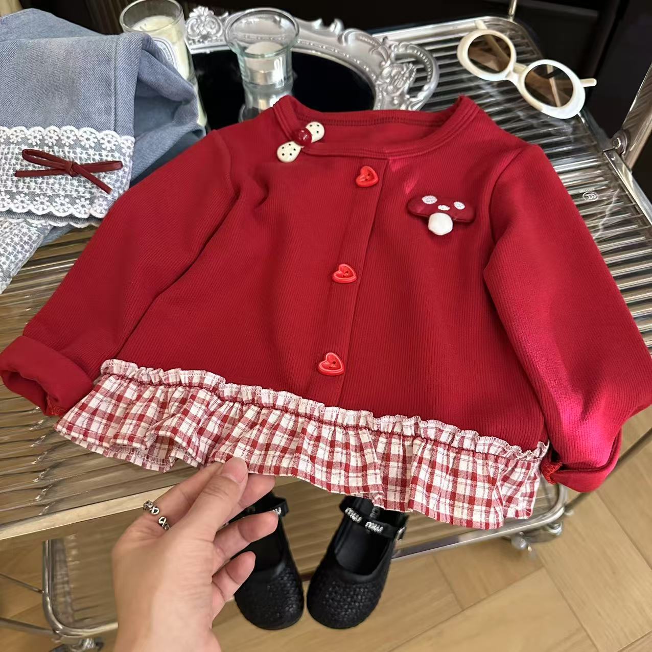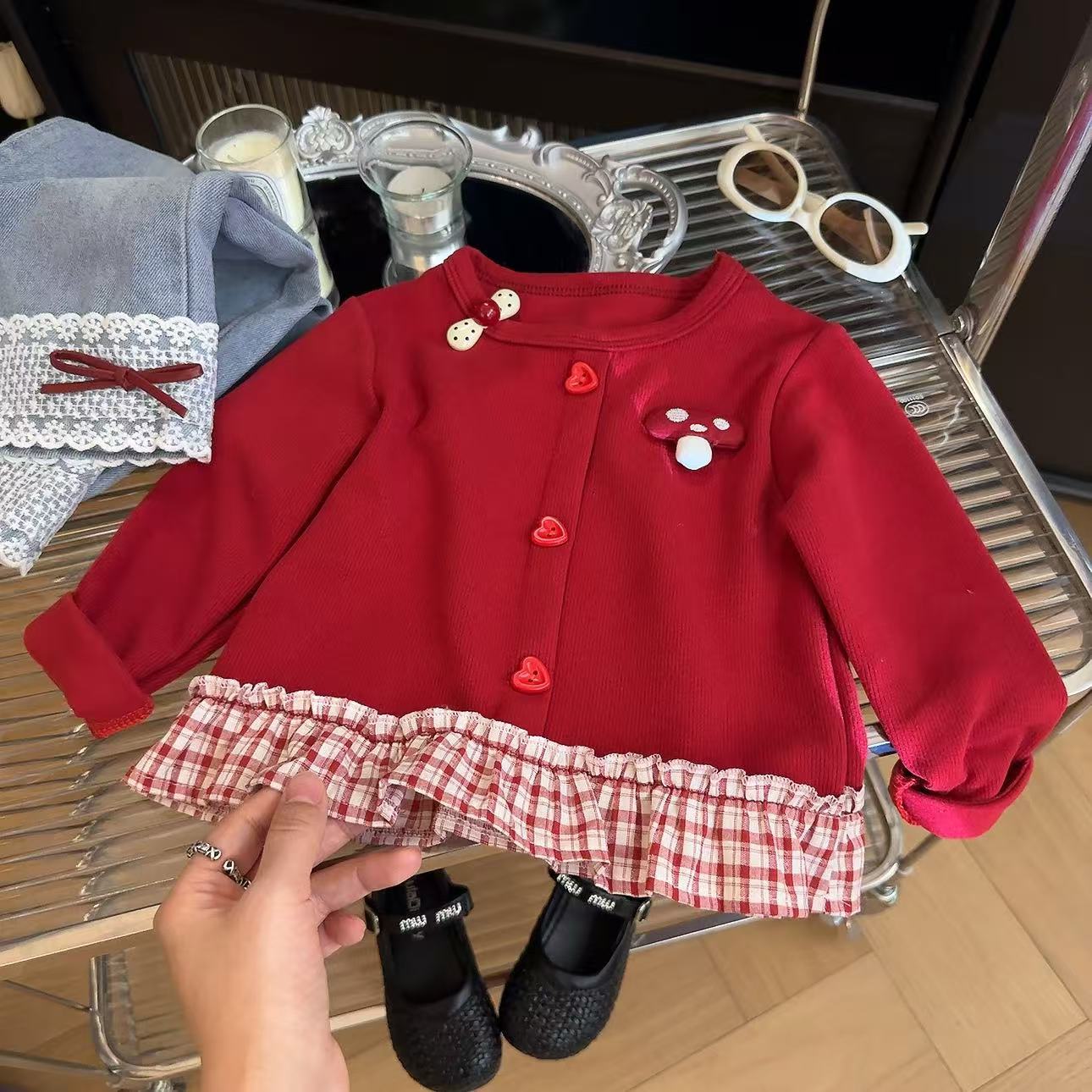Толстовка для девочек 2025 осень новый корейский стиль повседневная модная милая красная грибная вставка юбка толстовка