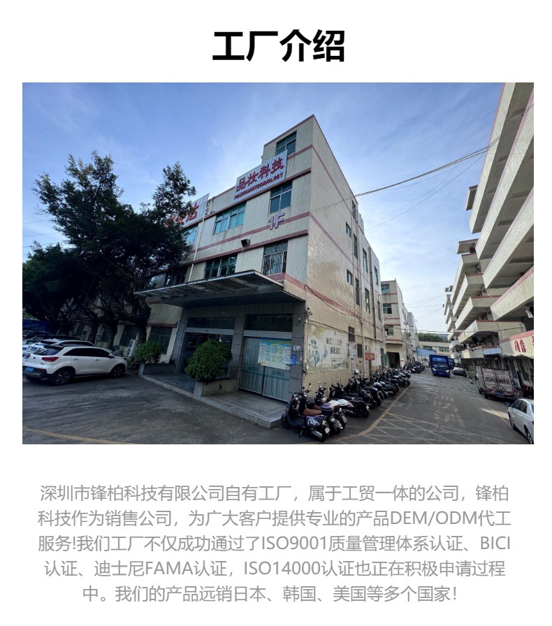 深圳市锋柏科技有限公司于2025年成立于深圳。本公司是工贸一体的公司,工厂同位于深圳市宝安区松岗街道,工厂通过了ISO9001质量管理体系认证、BICI认证、迪士尼FAMA认证,公司秉承“质量第一、顾客至上、诚信经营”为准则,以时尚魅力、换发青春为理念,致力于美妆工具、美容仪器、个人护理类产品的设计研发、生产制造、销售为一体的专业型现代化公司,同时还为广大客户提供专业的产品DEM/ODM代工服务,公司自营产品自上市以来,以潮流先锋、时尚个性、精致卓越,独特完美的外观设计,突出的性价比和优良稳定的产品性能,出口海外数十个国家和地区!赢得了海内外客户的一致好评与认可!