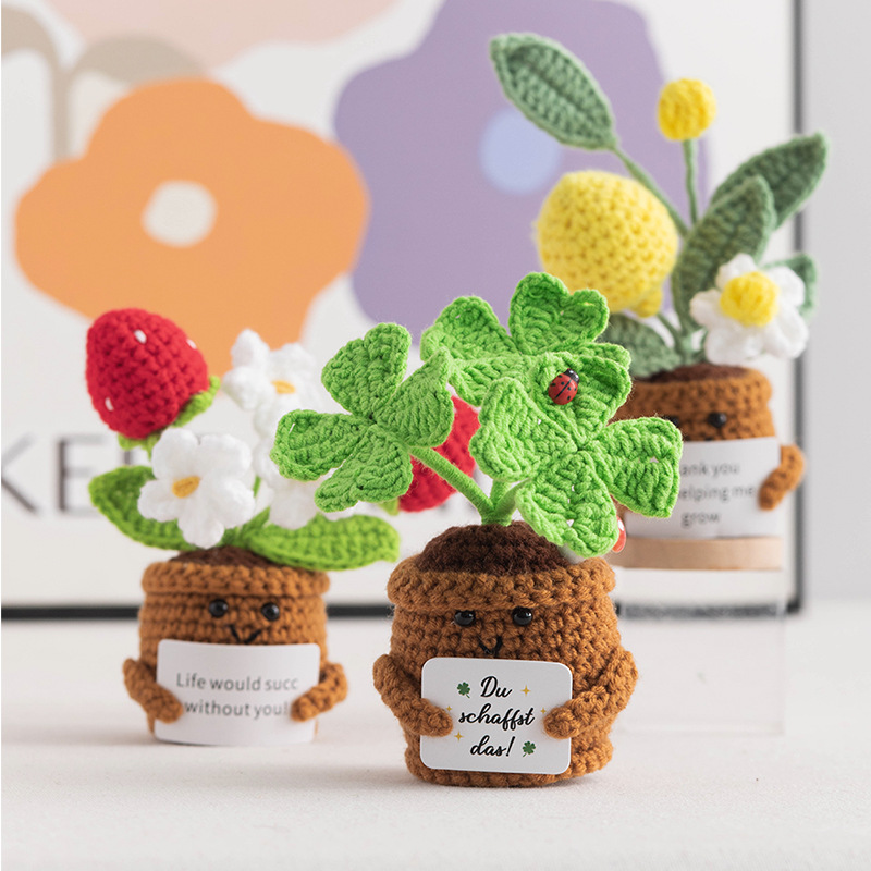 Кукла с положительной картой для поддержки, настольные украшения, готовый букет из шерсти, вязаные горшечные растения