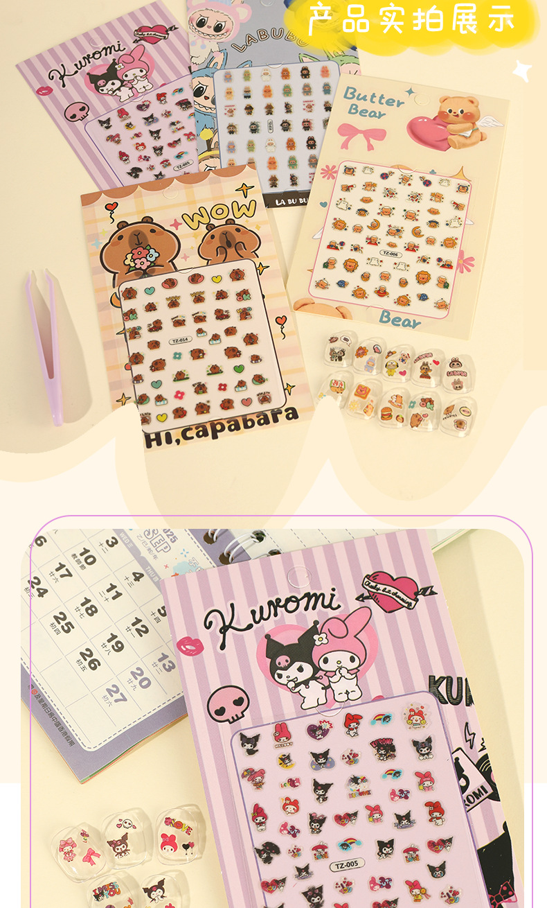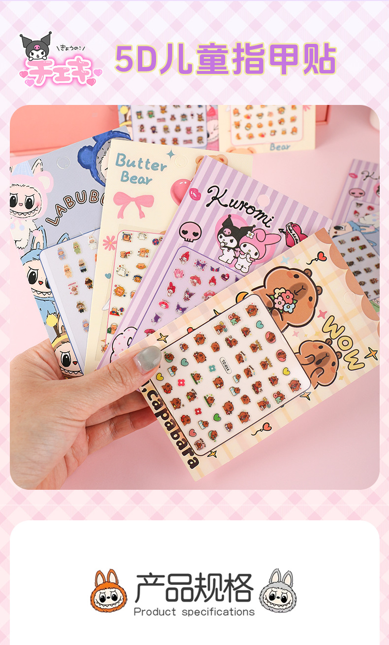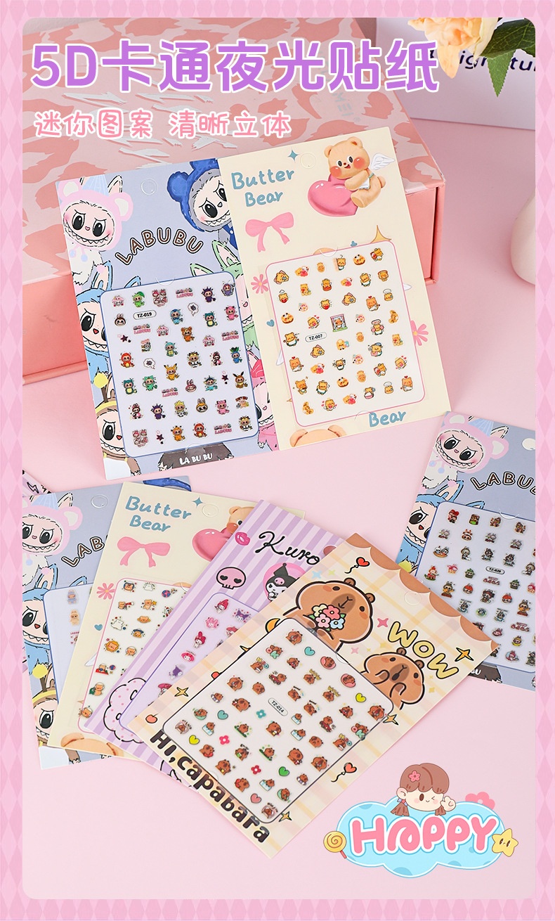 Лабубу 5D светящиеся наклейки для ногтей, мультяшные наклейки для девочек, водонепроницаемые декоративные наклейки для ногтей