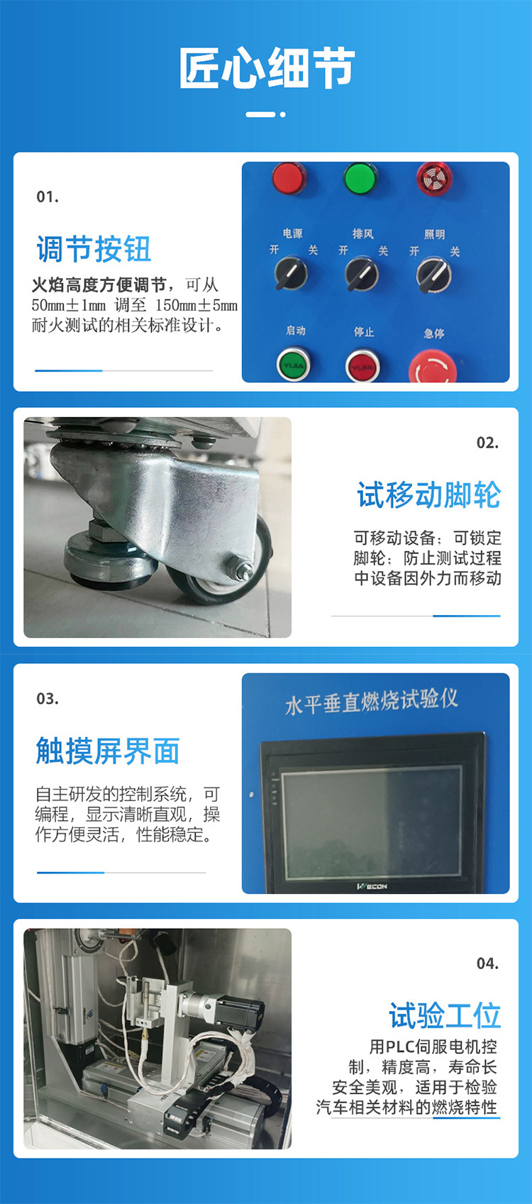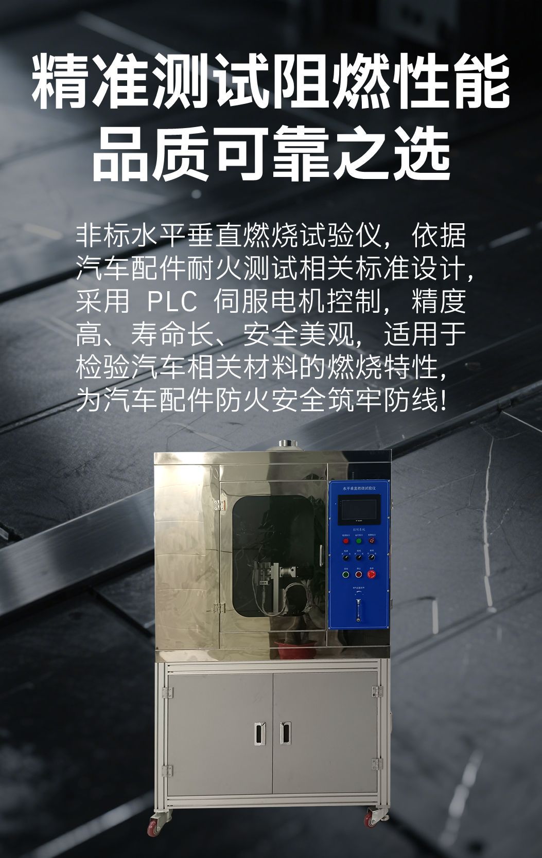 Применение Horizontal burning test (material placed horizontally) and vertical burning test (material hanging vertically) can be carried out to simulate the burning state under different usage scenarios