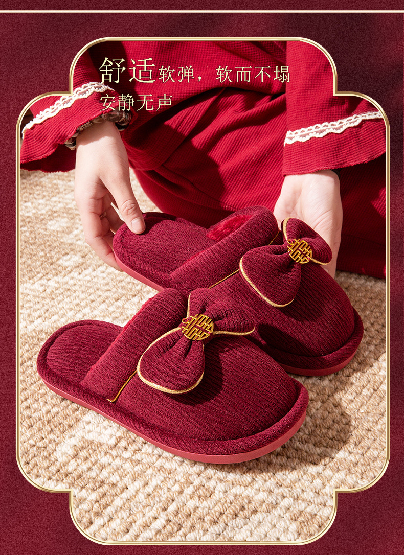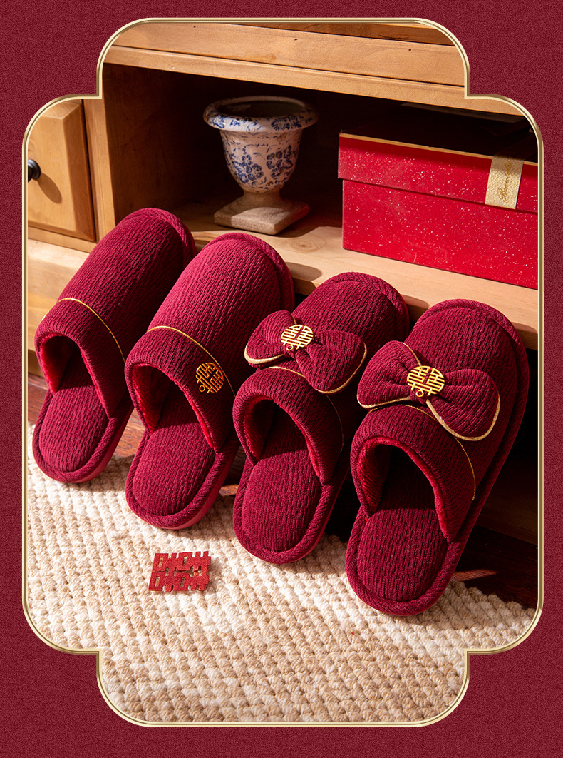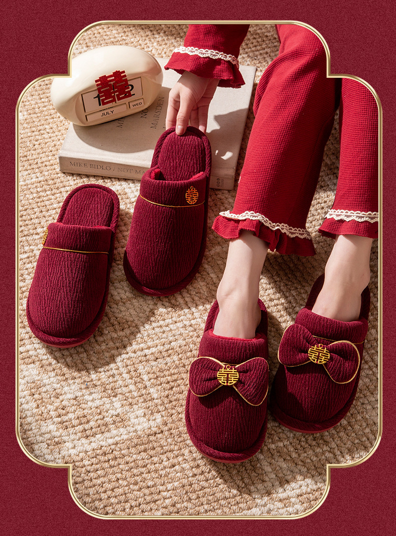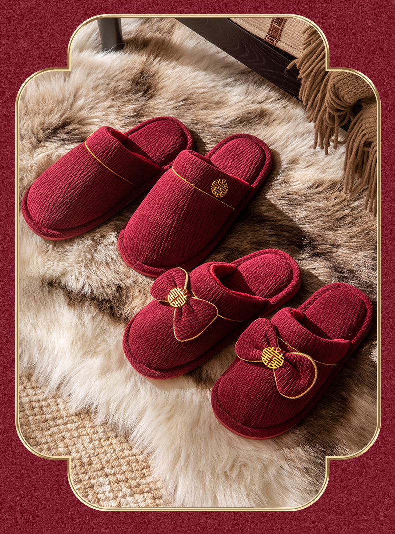 Зимние красные свадебные тапочки с бархатом и утолщением для невесты и жениха, свадебные торжества, приданое невесты, парные тапочки для дома