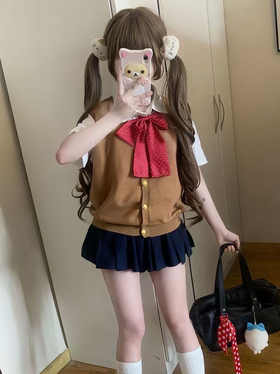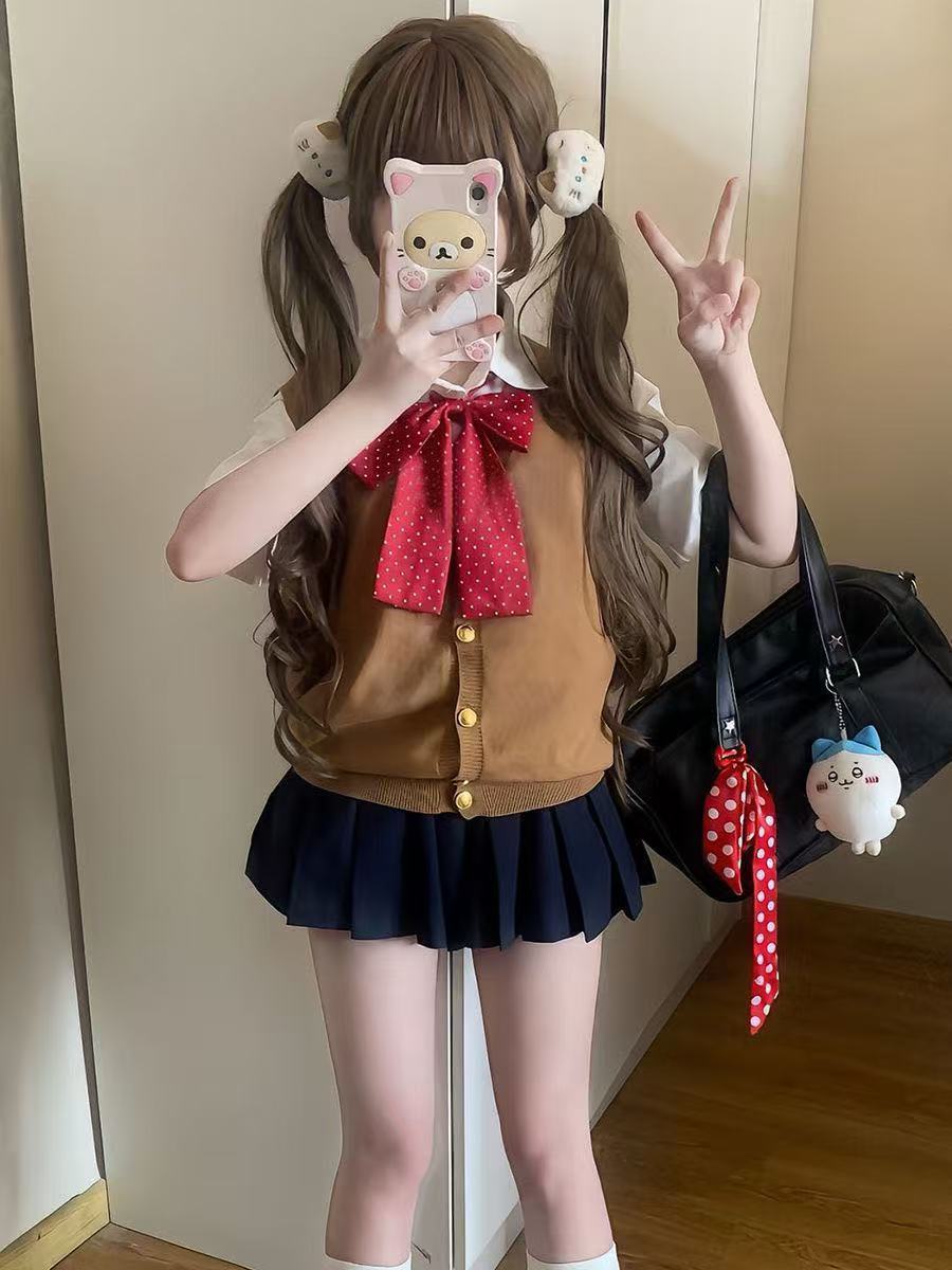 ![]() | White shirt + bow tie + navy pleated skirt + brown vest four-piece set | S | ¥60.5 / ≈ 729 ₽ | 1000 | 5912616960650 | |