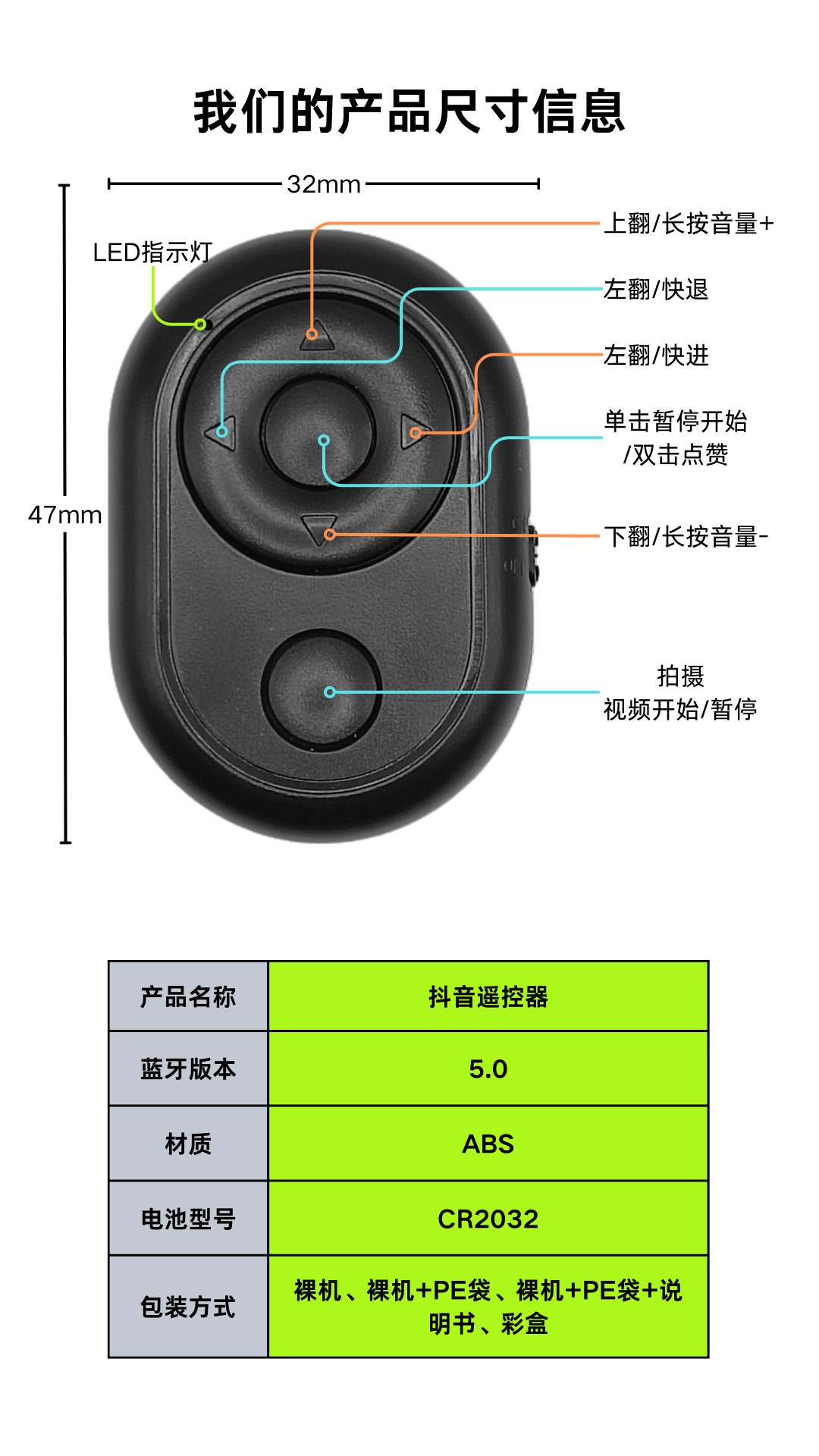 抖音遥控器、抖音控制器、抖音划屏器、翻页器、蓝牙自拍器、抖音刷屏神器