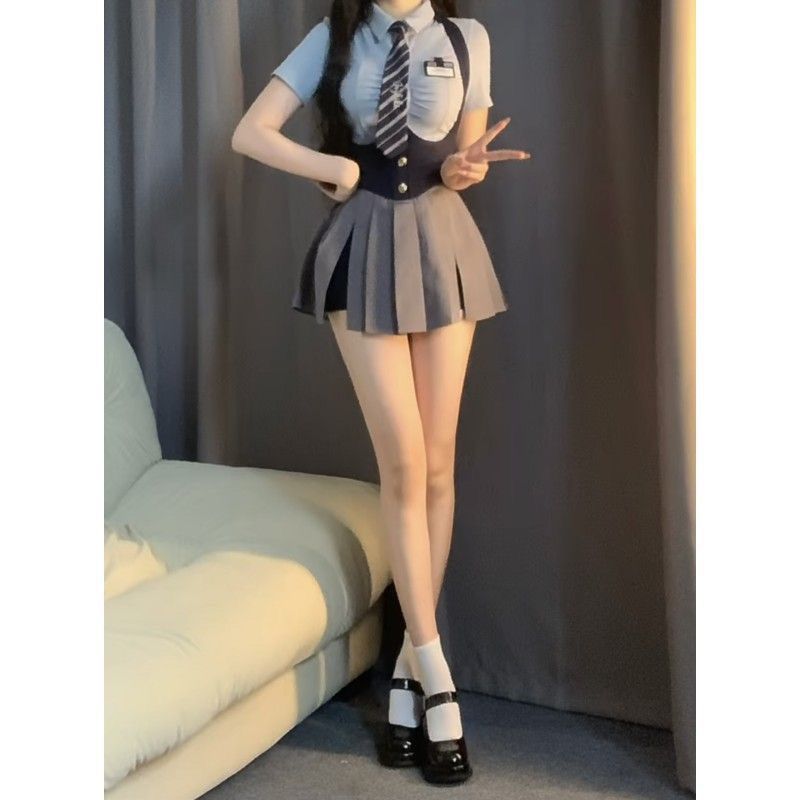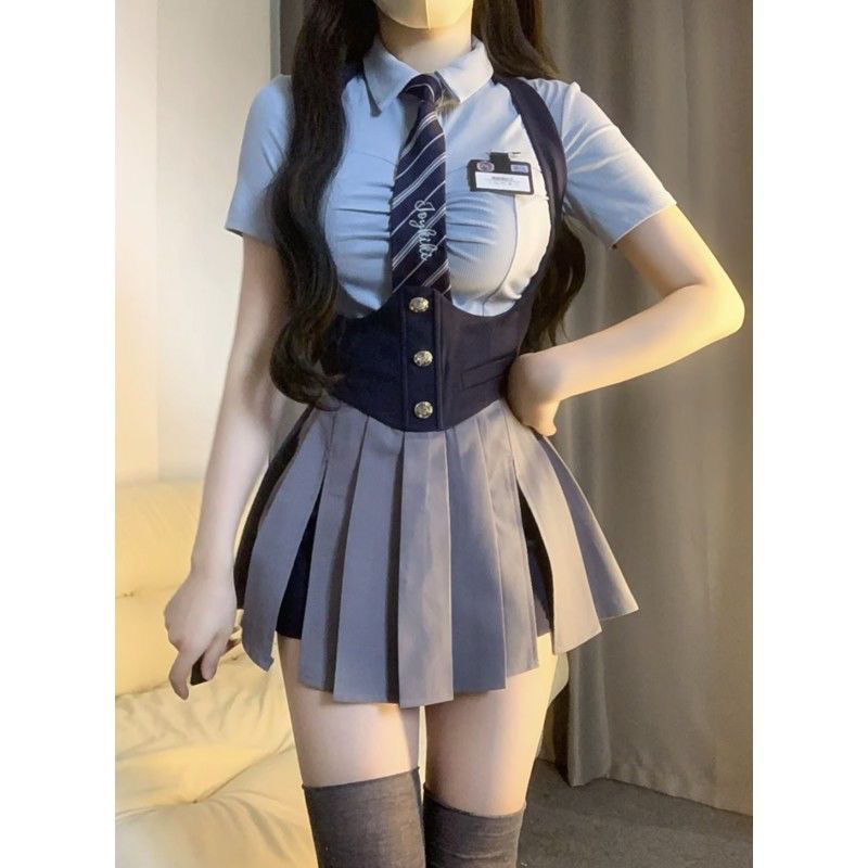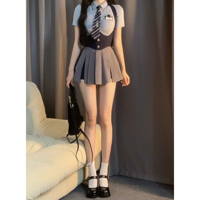 Костюм униформы колледжа, юбка с подтяжками, рубашка с плессировкой, высокая талия, контрастная отделка, летний стиль для женщин