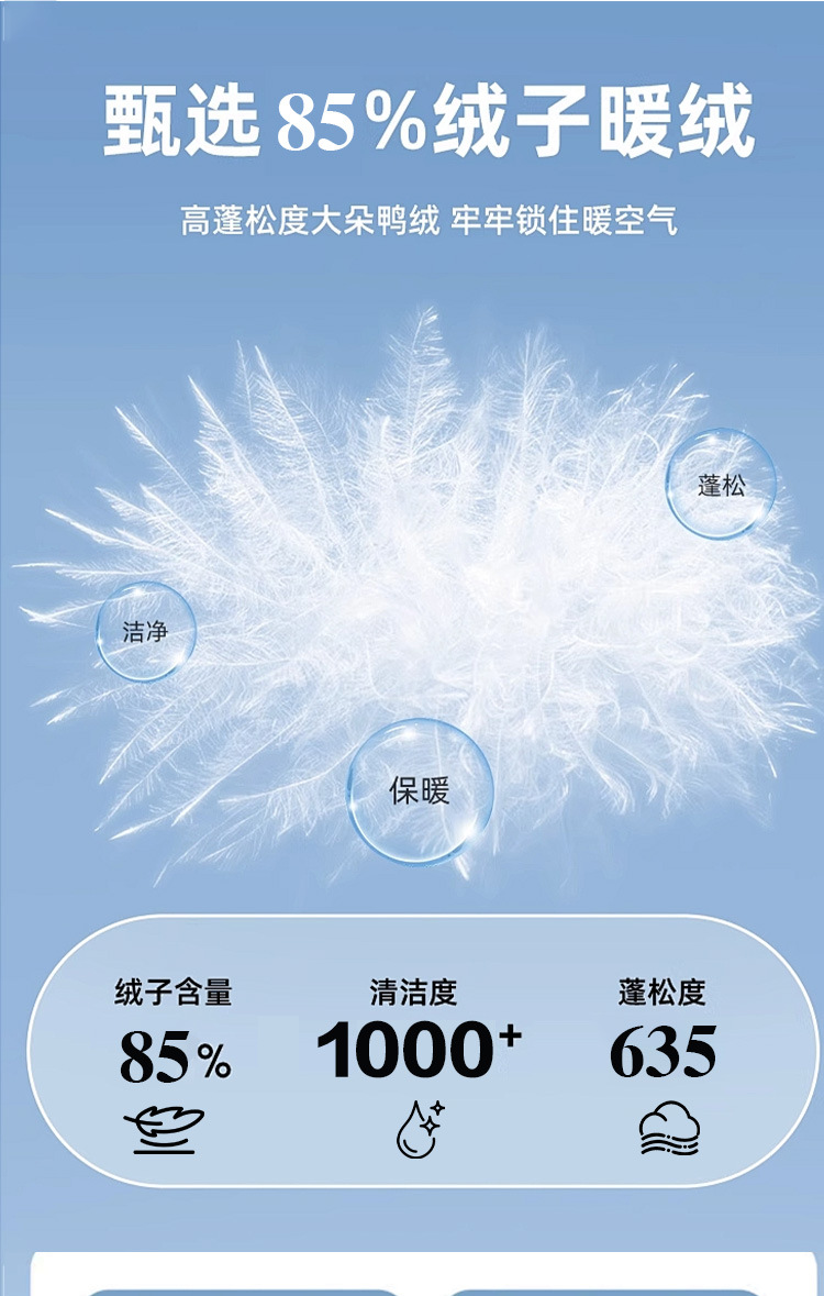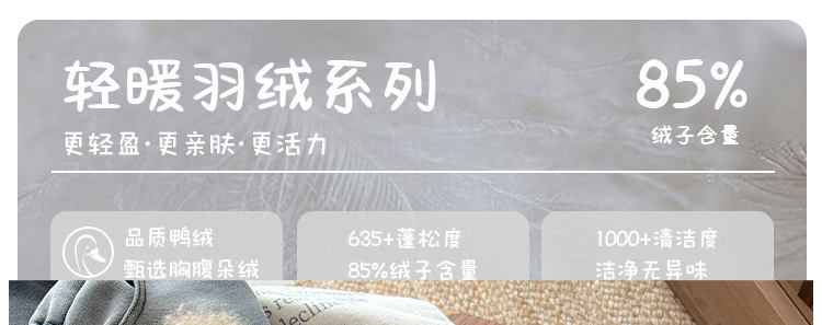 主填充物:鸭绒 绒子含量 85% 局部填充物: 100%聚酯纤维