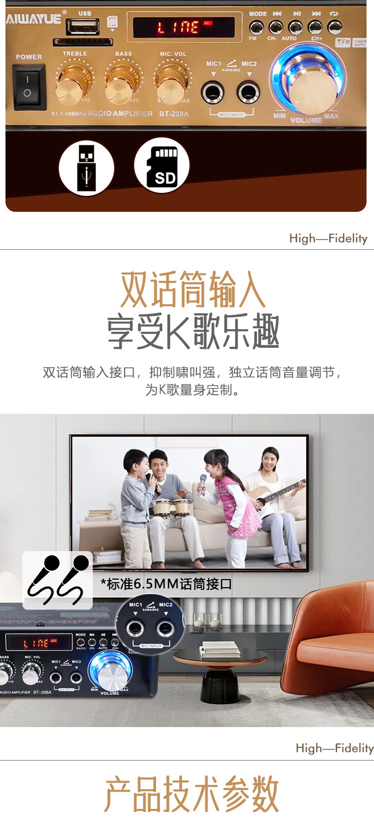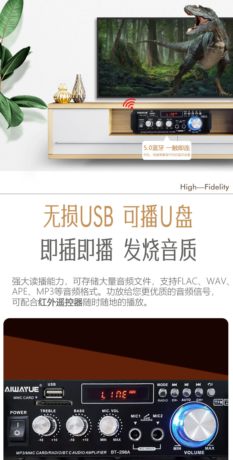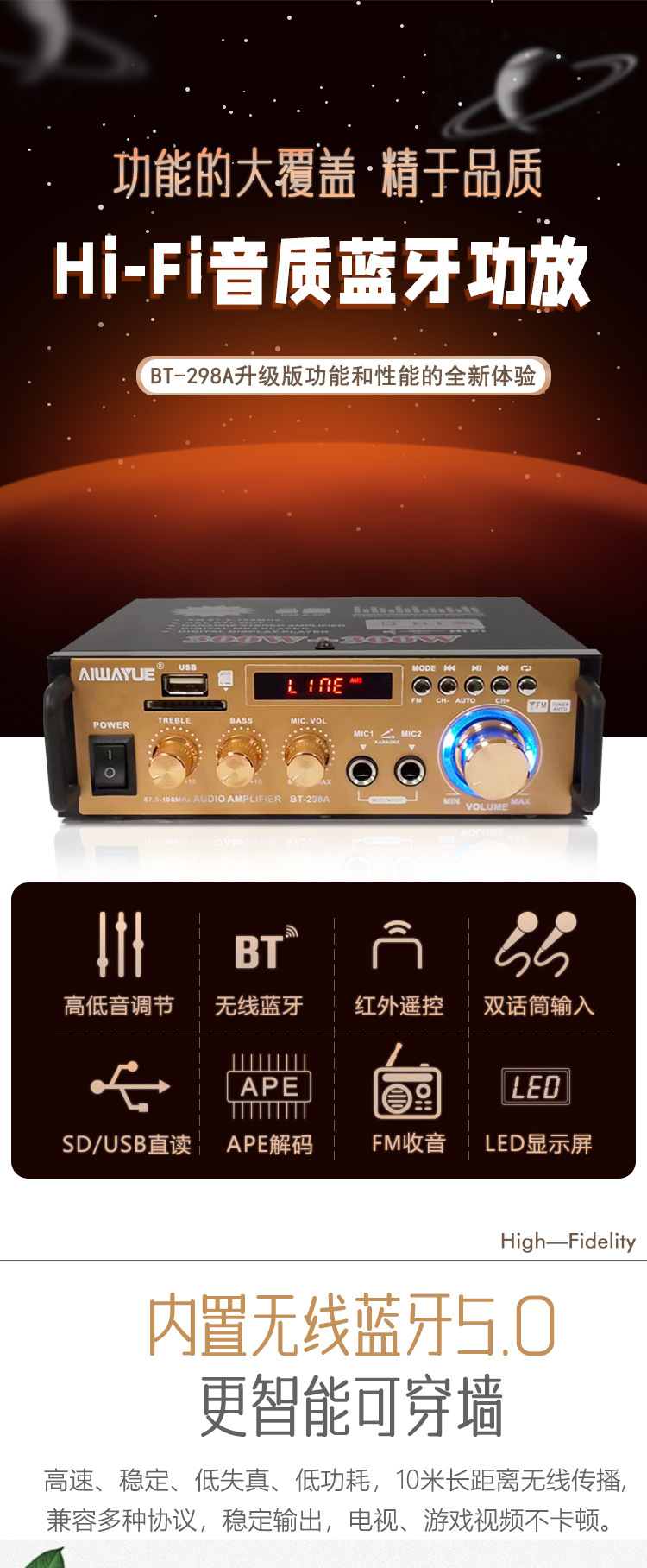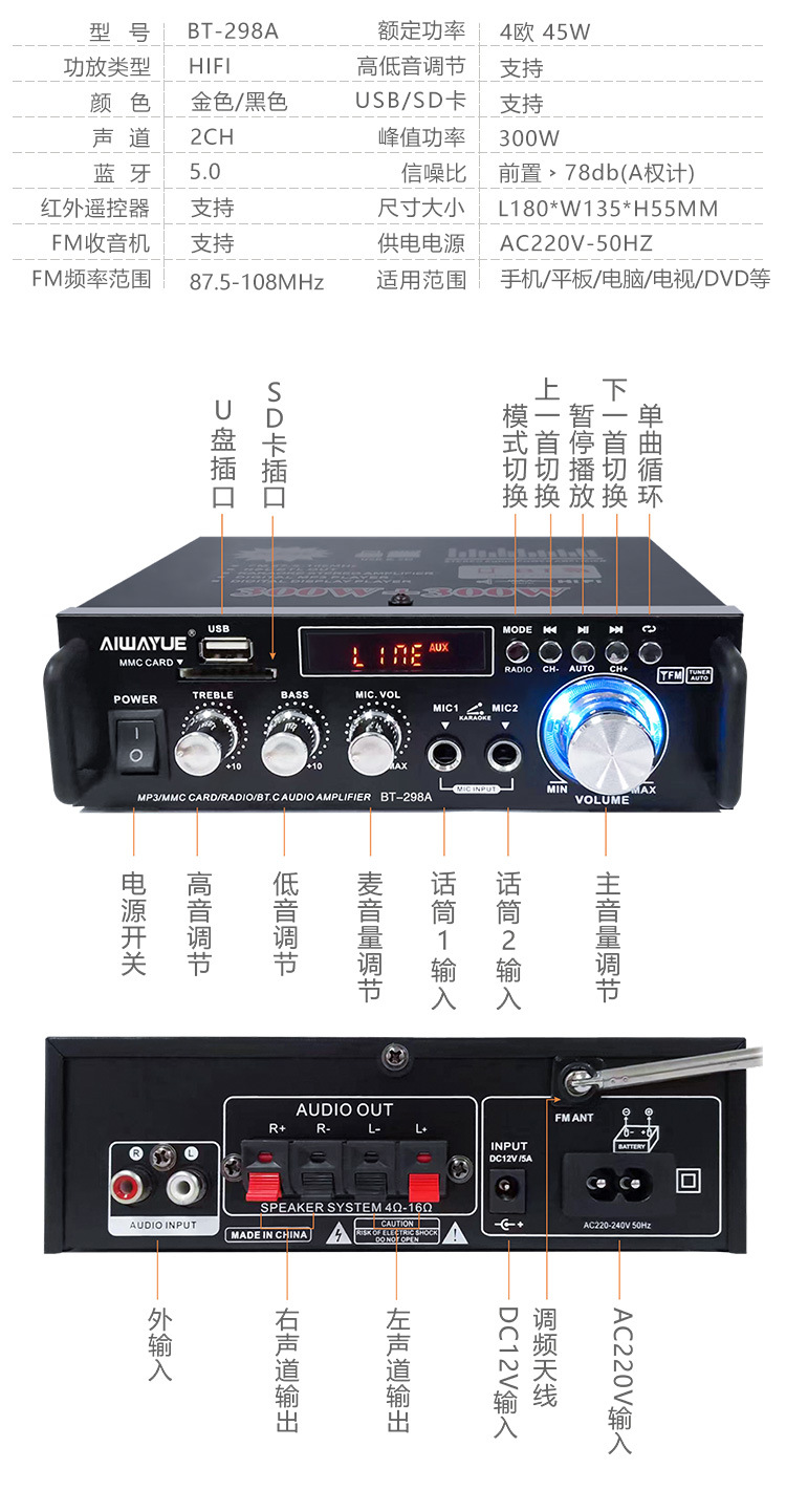 Bt-298A мини Bluetooth усилитель звука с качеством Hi-Fi, вставляемая карта USB, дистанционное управление