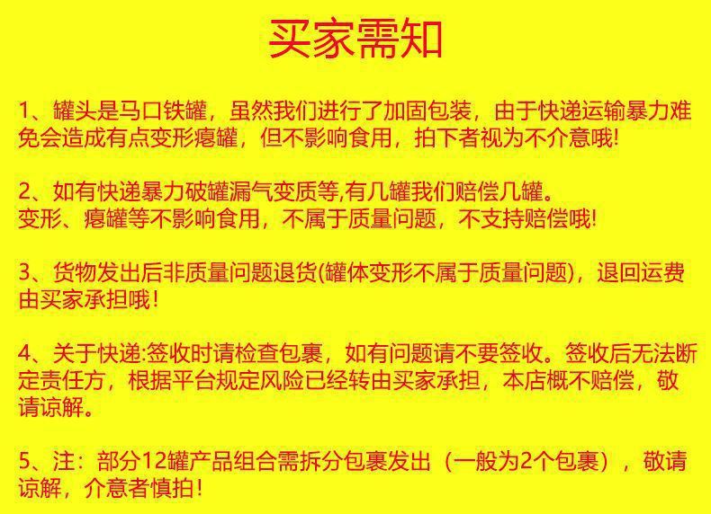 买家须知:仓库发货前都会检查,快递路上暴力运输,可能会造成少量罐被压的情况(不处理售后),如有漏液,可赔付漏液的差价;因罐头较重,货品一经发出不支持拒收,有问题可及时咨询客服处理。