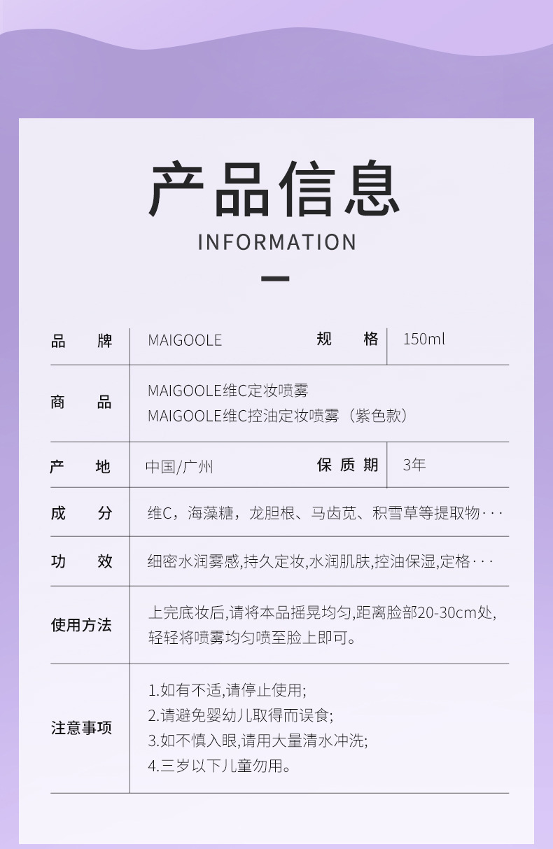 ![]() | Madeline vitamin c oil control makeup setting spray 150ml (purple style) | 150ml | ¥3.1 / ≈ 37 ₽ | 8742 | 5914892136928 |