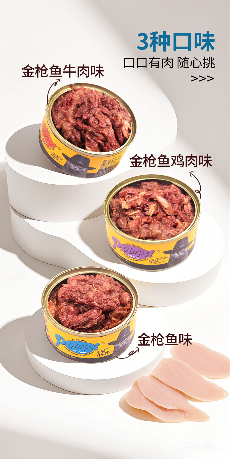![]() | 170g/can | Tuna + chicken flavor | 48шт: ¥2.45, 480шт: ¥2.20, 4800шт: ¥1.98 | 9999999 | 6084777894919 | |