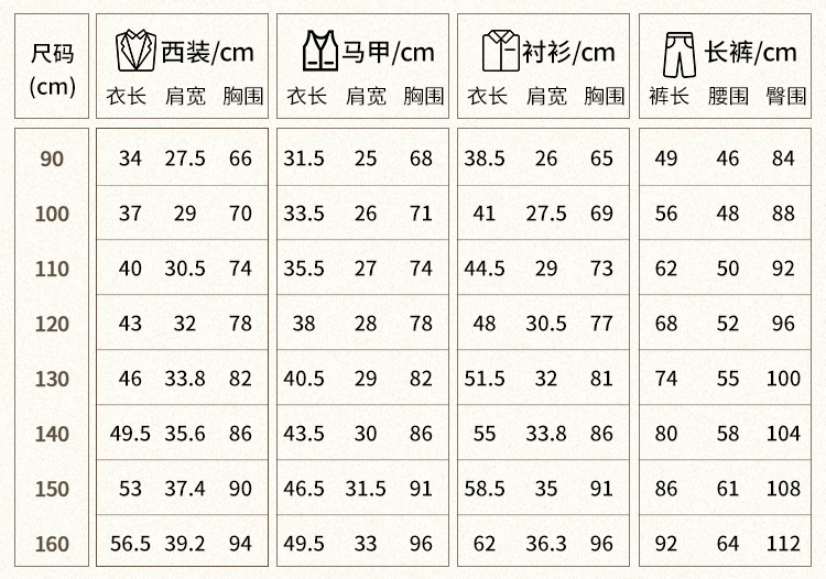 ![]() | Suit style + twill tie: khaki 5-piece set (93069 pure cotton blue long sleeve shirt + jacket + vest + trousers + brown striped tie) | 150cm, recommended weight 34-39.5kg | ¥119.74 / ≈ 1 442 ₽ | 162 | 5955014657835 | |