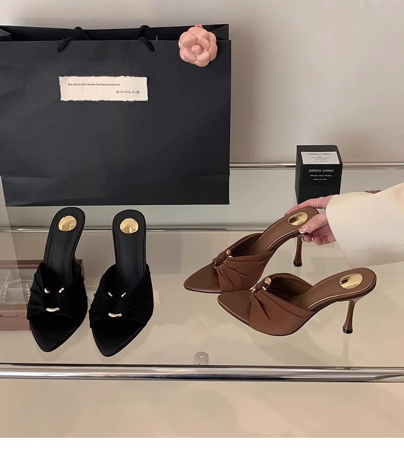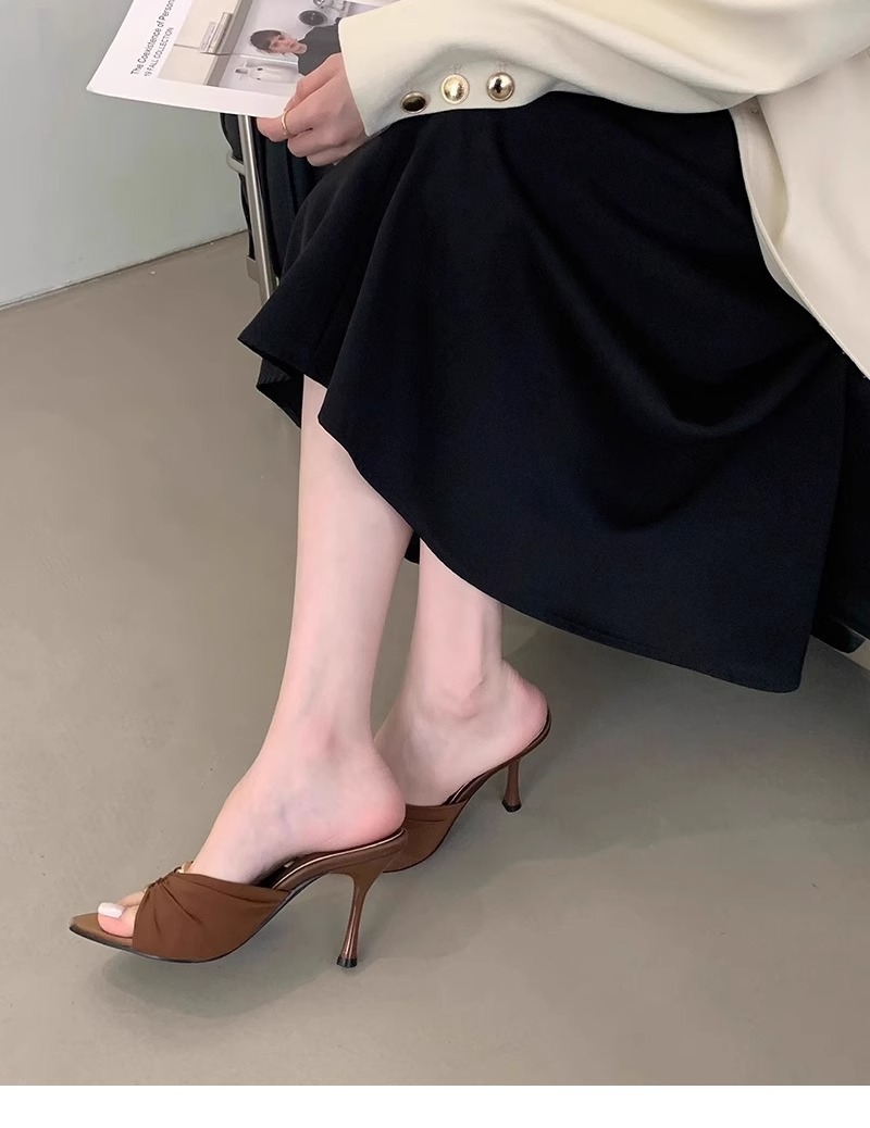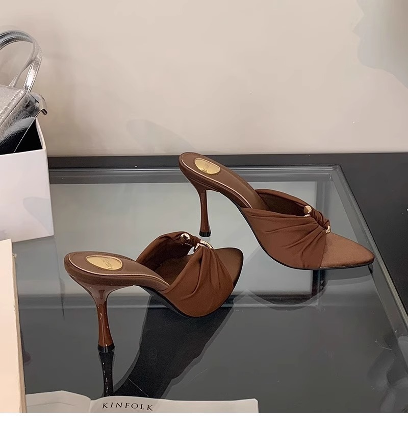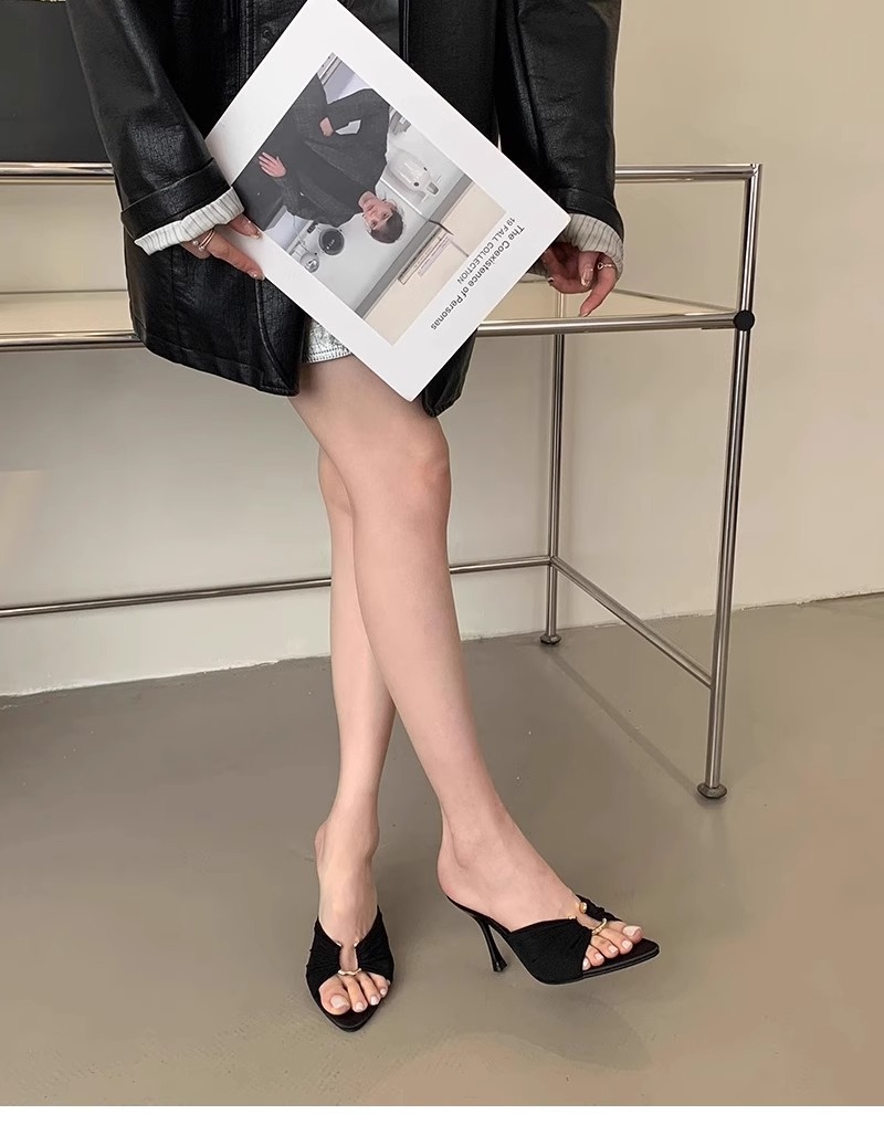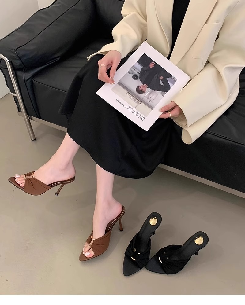 高跟鞋女2025年夏季新款褶皱金属扣气质尖头露趾凉拖性感细跟拖鞋