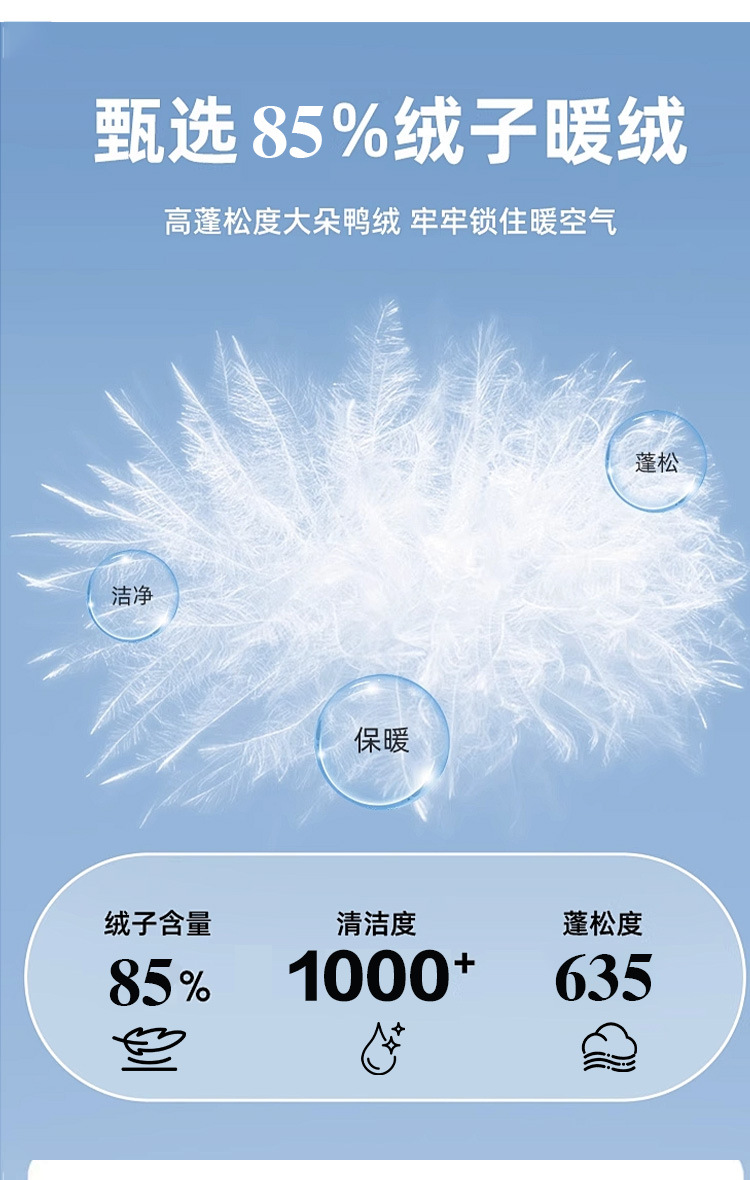 主填充物:鸭绒 绒子含量 85%局部填充物:100%聚酯纤维