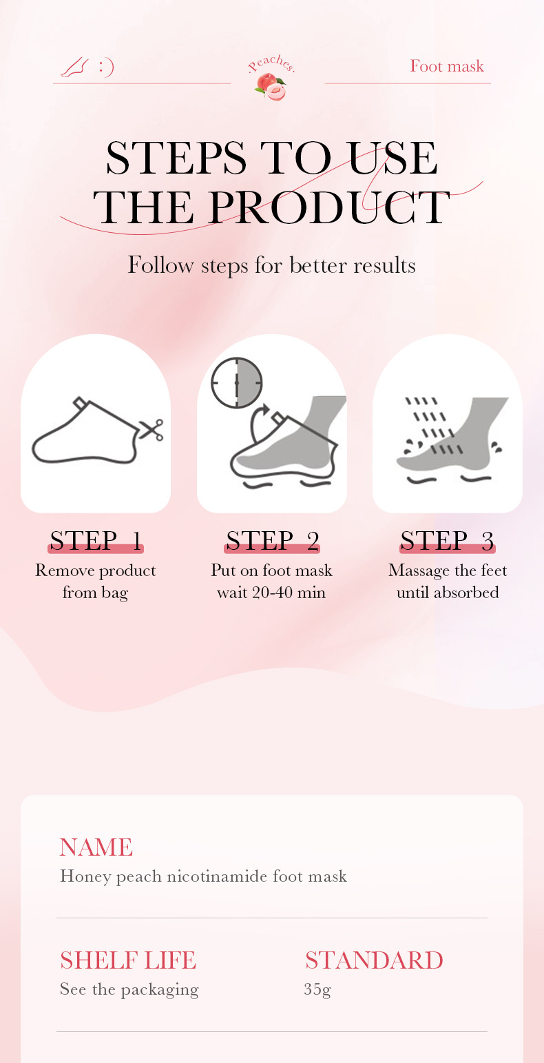 ![]() | Peach foot mask 35g/pair (for foreign trade sales only) | ¥1.0 / ≈ 12 ₽ | 519320 | 5922600180177 | |