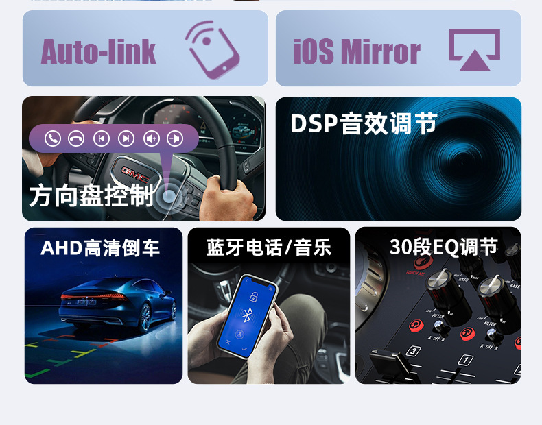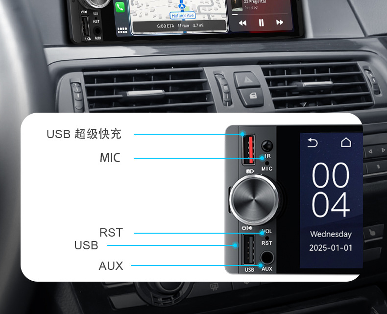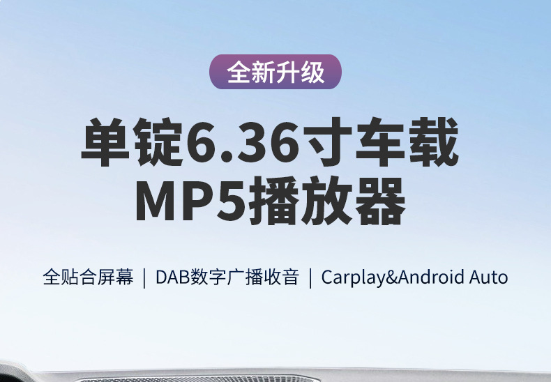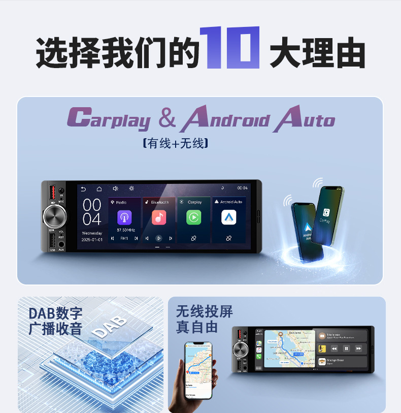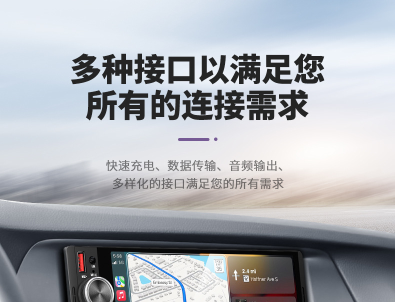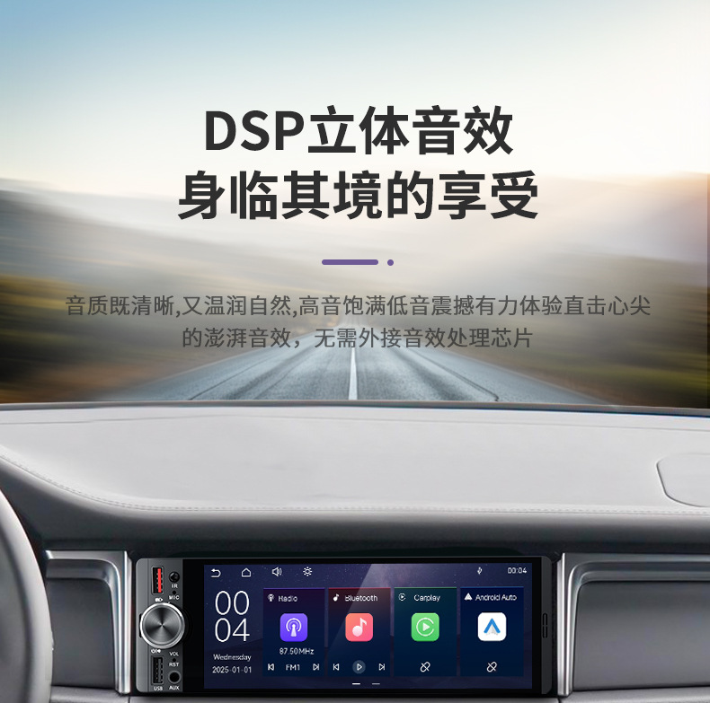 6.36寸单锭1din车载mp4/mp5播放器支持无线carplay/android auto,手机投屏,超级协议快充,dsp,ahd高清倒车,收音FM/AM/RDS,linux车机