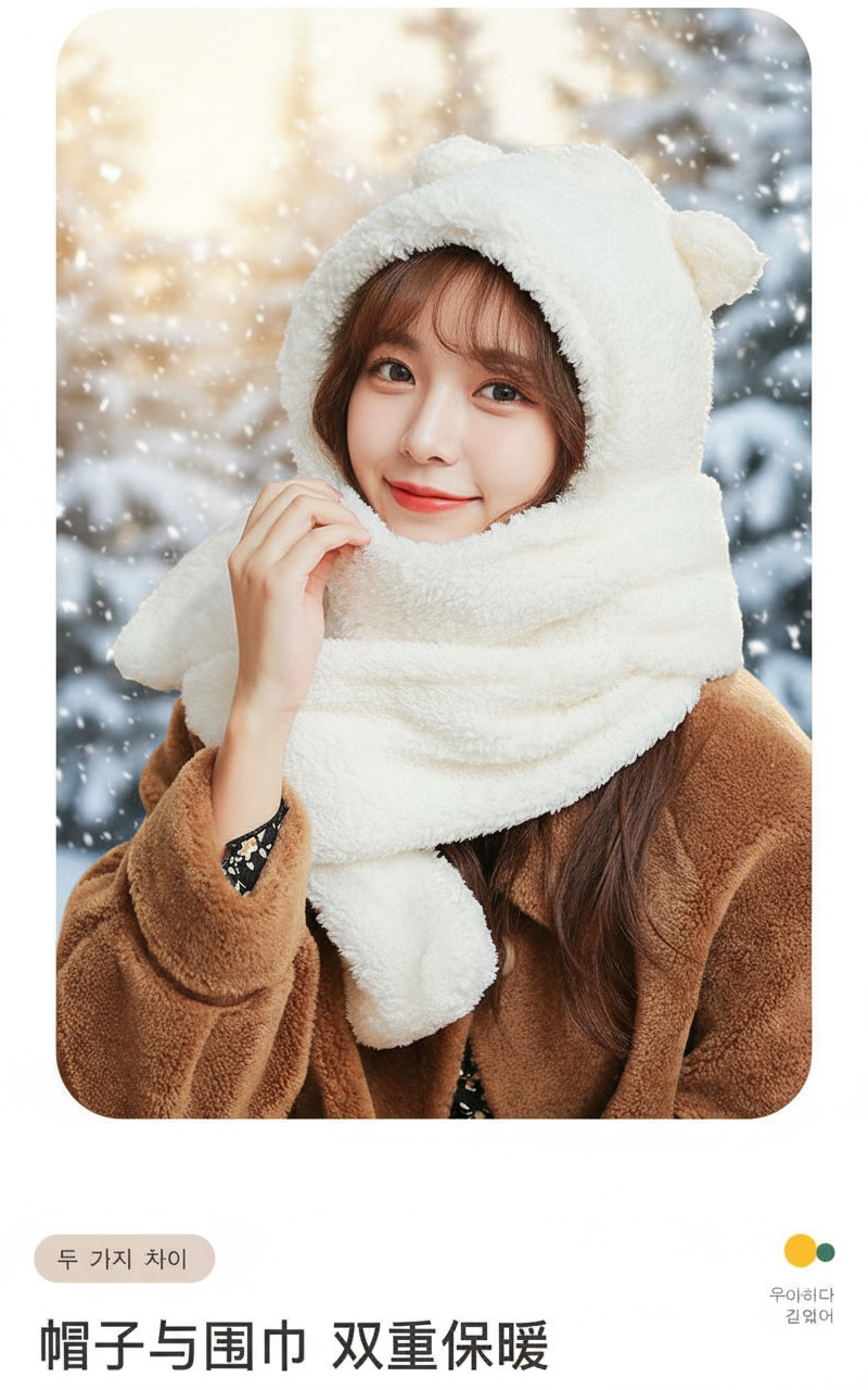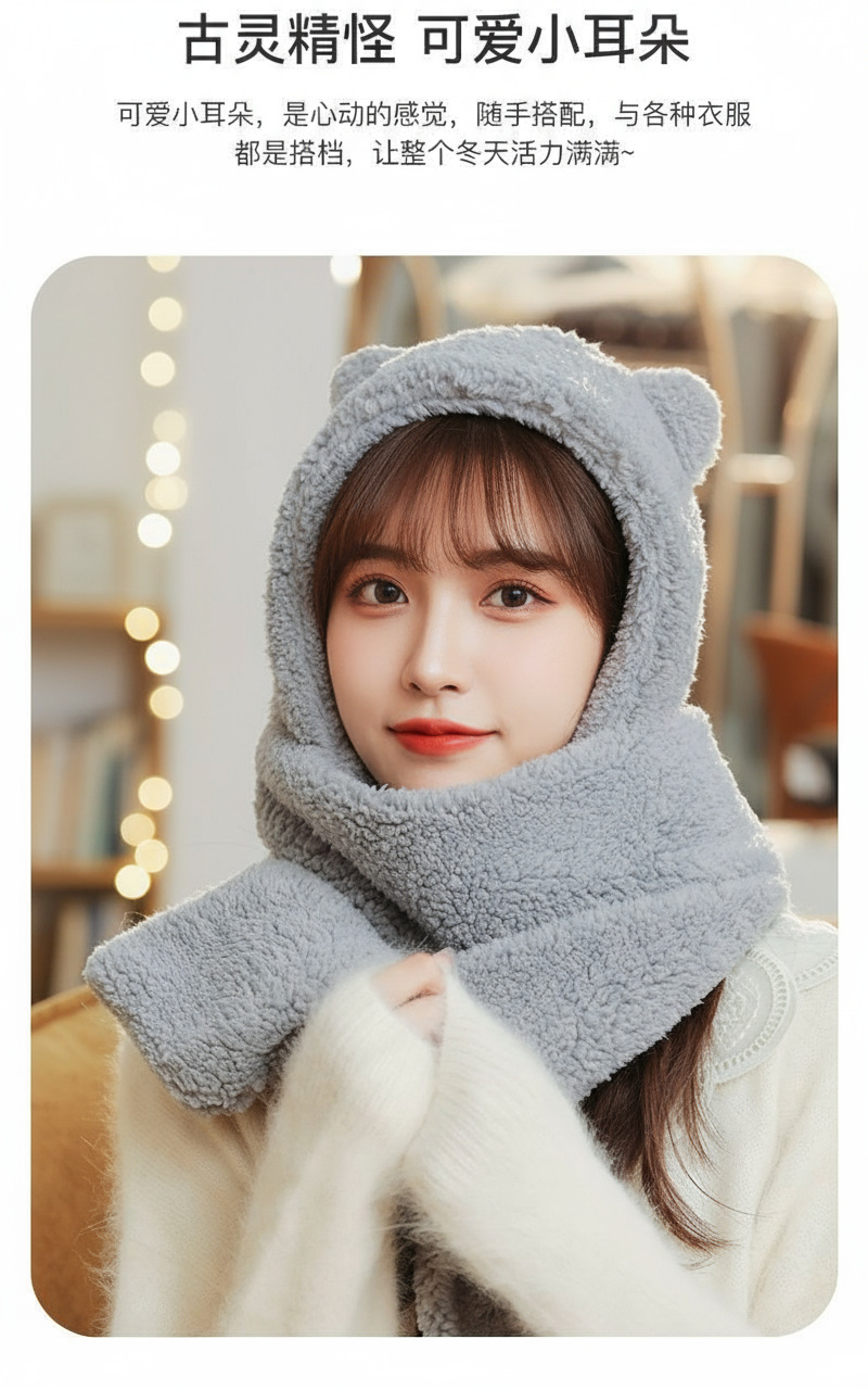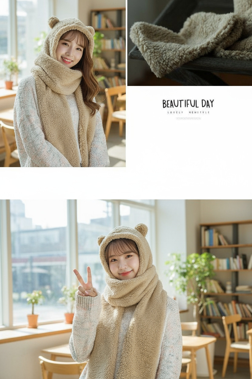 Шапка с шарфом в одном флаконе, шапка с медвежьим дизайном, осень и зима, утепленная, милая плюшевая шапка, теплый комплект