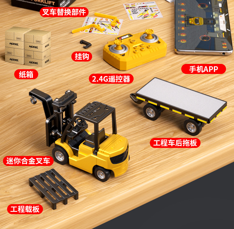 合金货叉*2、遥控器*1、吊车钩*1、配件包*1、CR2032电池*1
