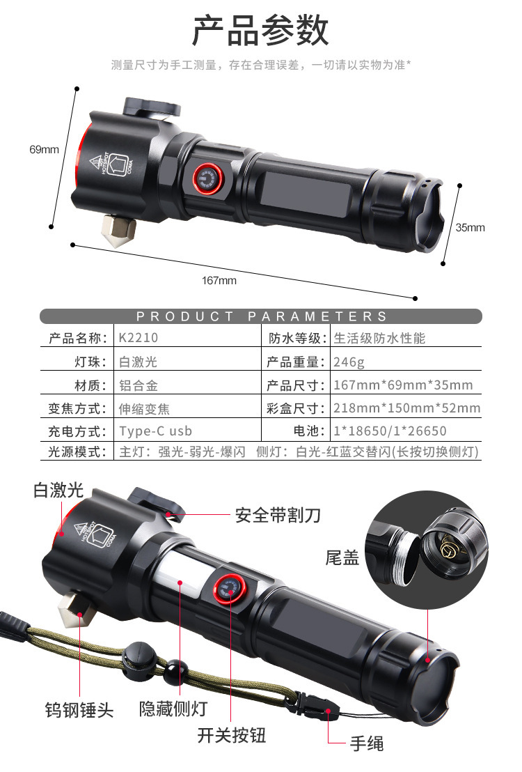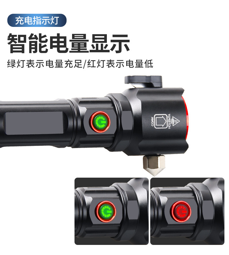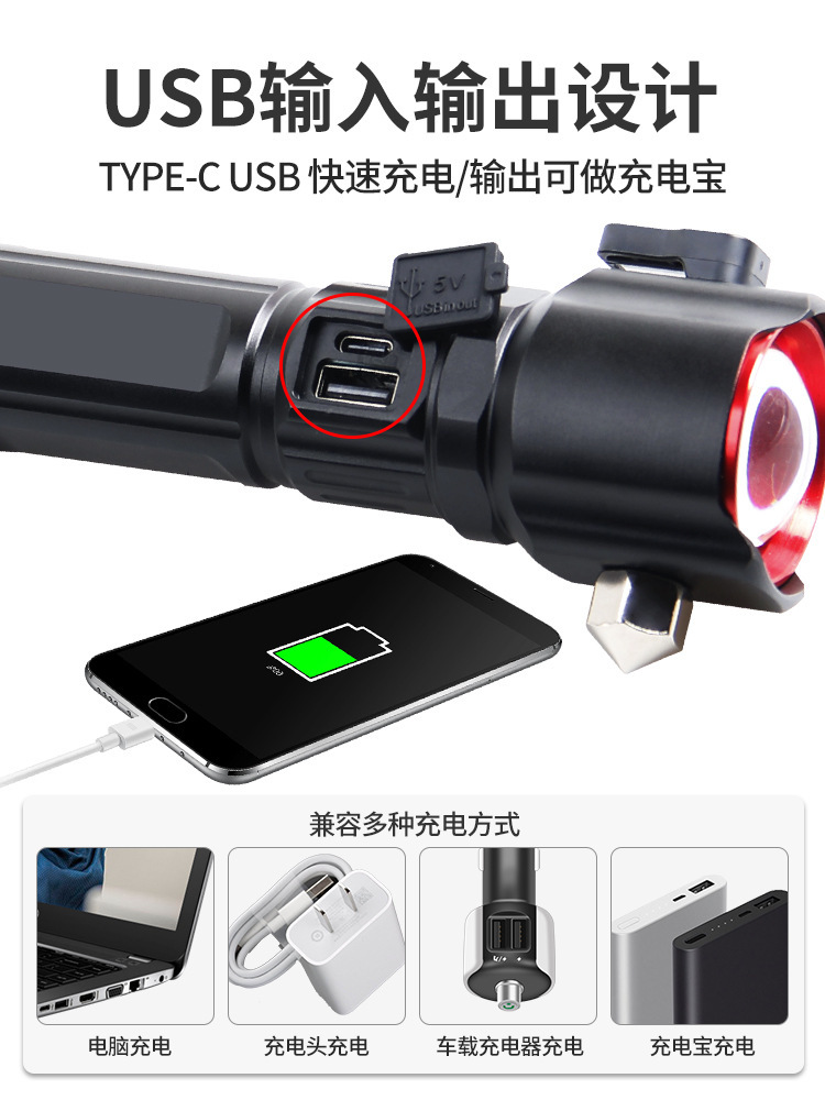 Кросс-бордерная мощная белая лазерная лампа, USB зарядка, C-порт, аварийный молоток, предупреждающий красный и синий свет, рабочая лампа для патрулирования, фонарик