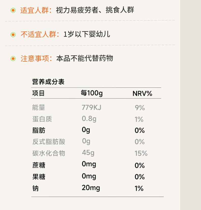 Основные питательные компоненты Superoxide dismutase, total flavonoids, total carotene, prebiotics, dietary fiber