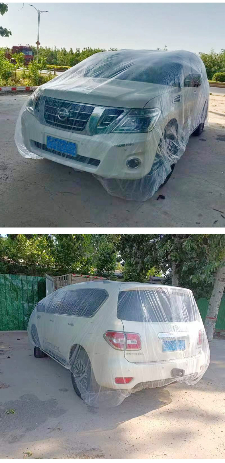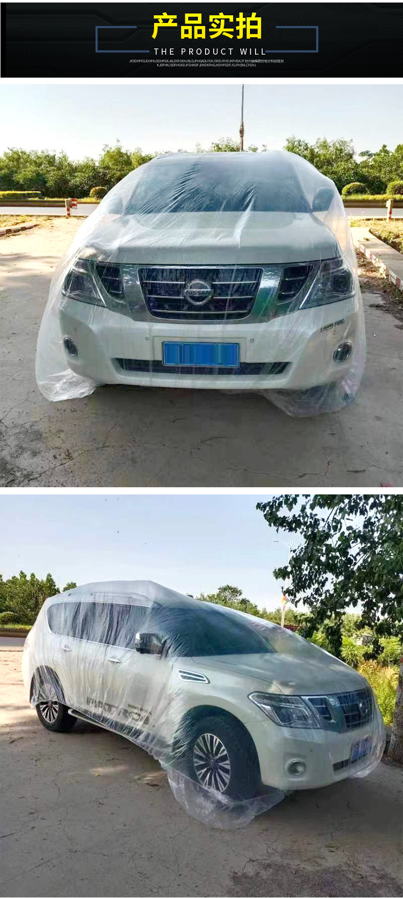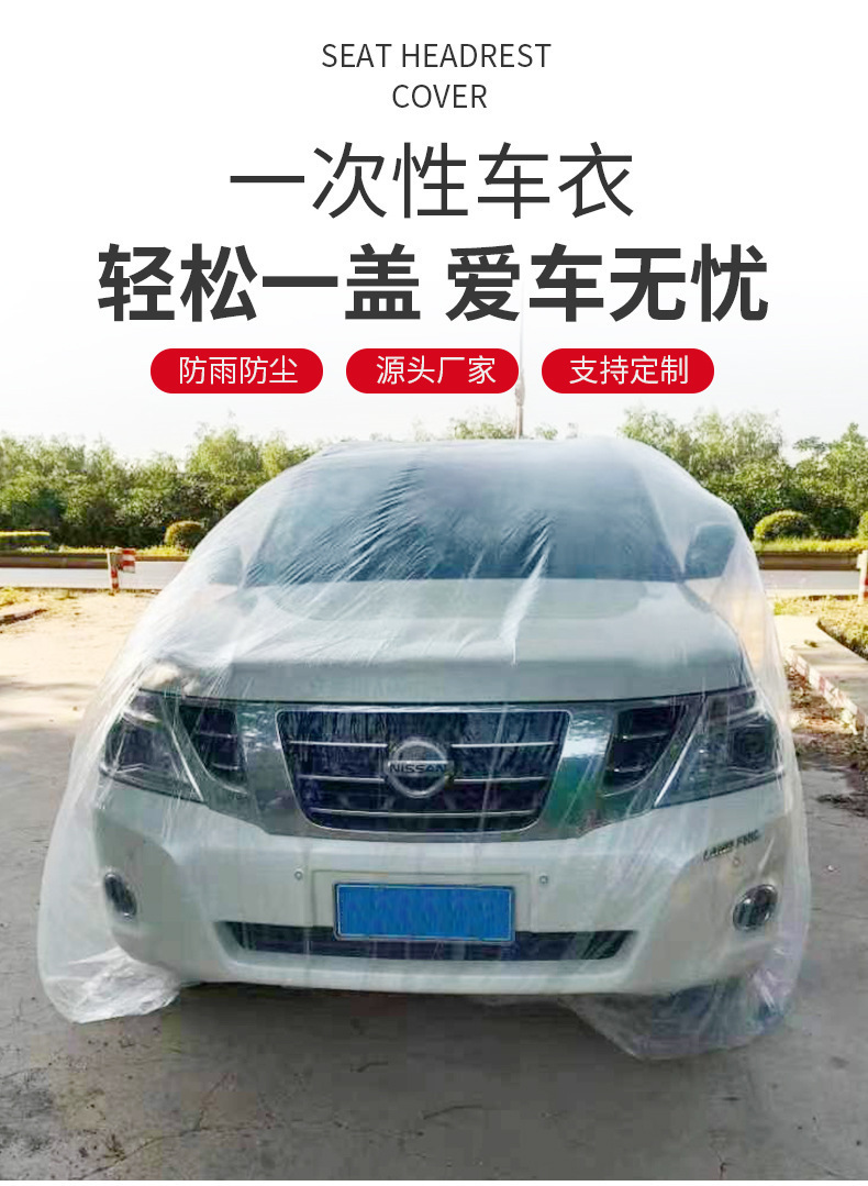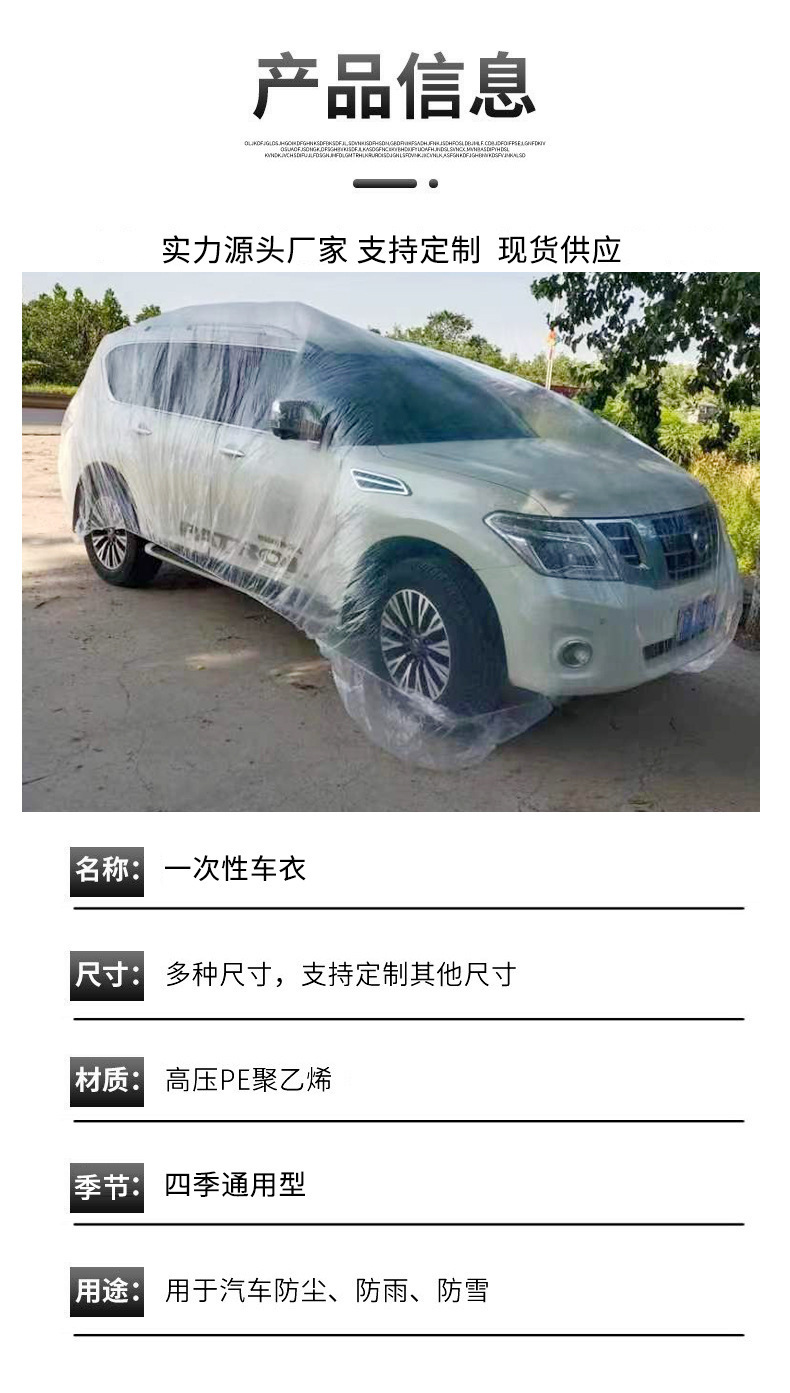一次性车衣是由聚乙烯塑料材料(LLDPE)制作而成。主要用来防尘,防污染,防雨雪霜降。携带方便,多用于车辆的仓储存放,露天存放,以及高污染环境中的车辆存放等