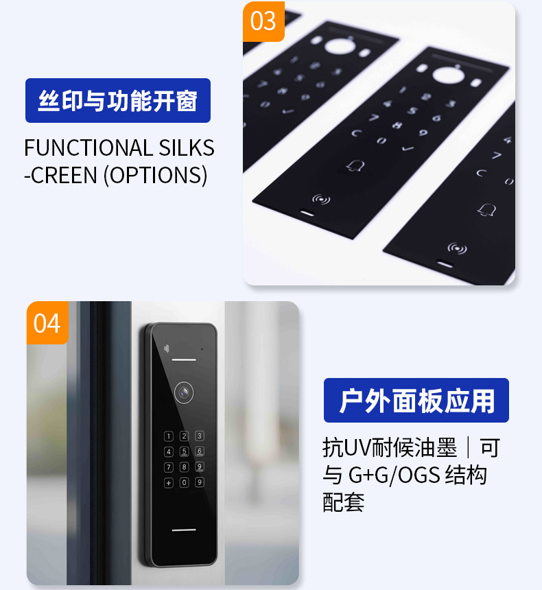 Уличная производительность Weather-resistant ink resists uv fading, making it ideal for outdoor use. it's highly visible in bright light, minimizes accidental touches from raindrops, and is designed for full-laminated structures. supports camera window and infrared cutout