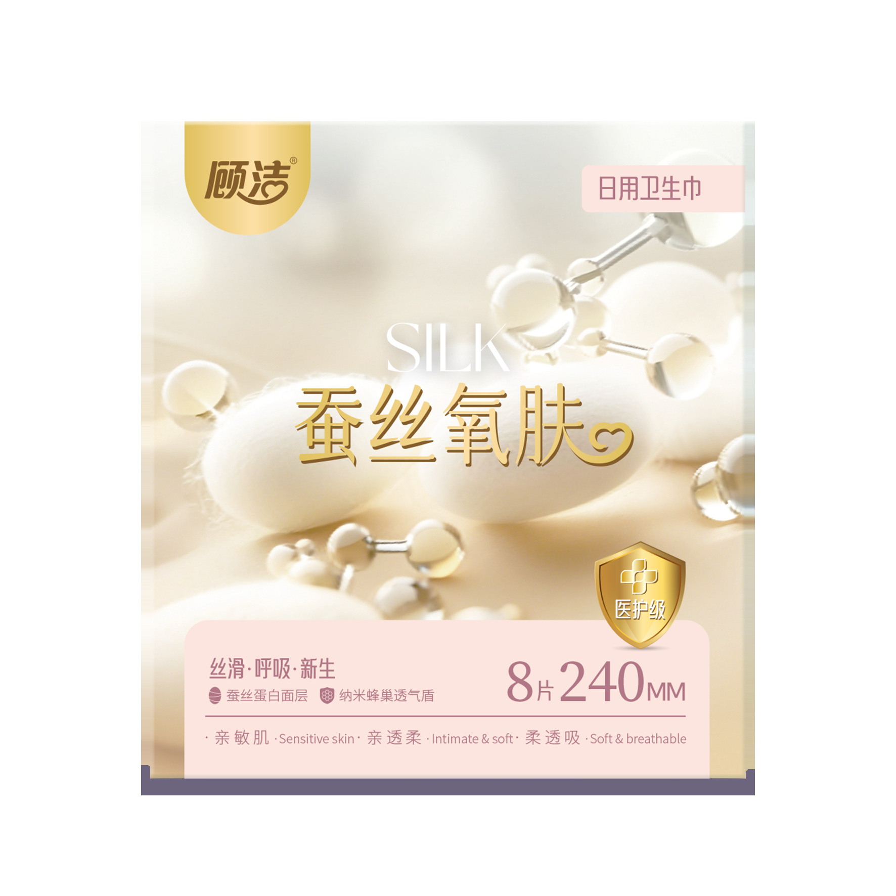 顾洁卫生巾240,蚕丝蛋白面层,柔软亲肤,裸感呼吸,平衡私处,透气底膜自由呼吸。