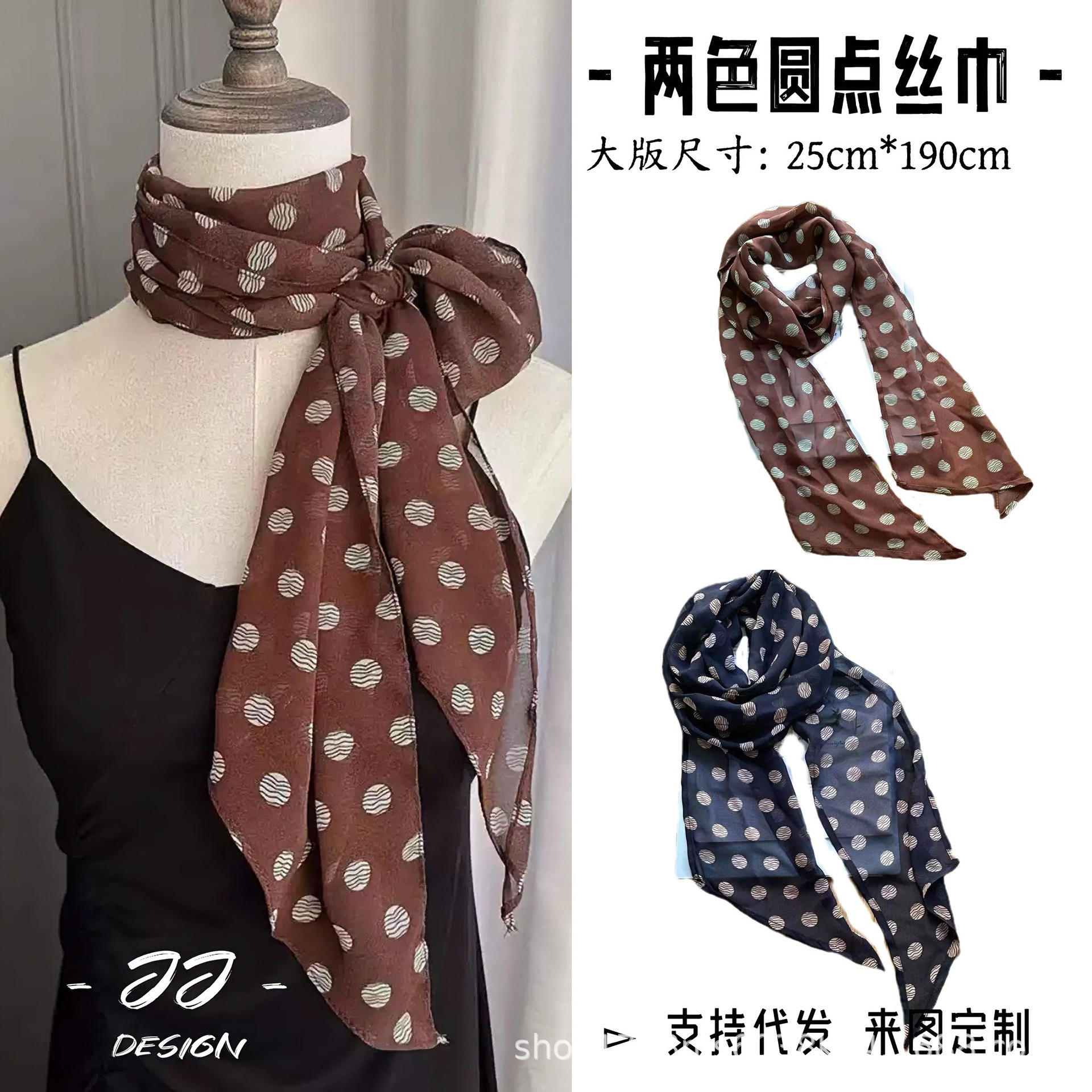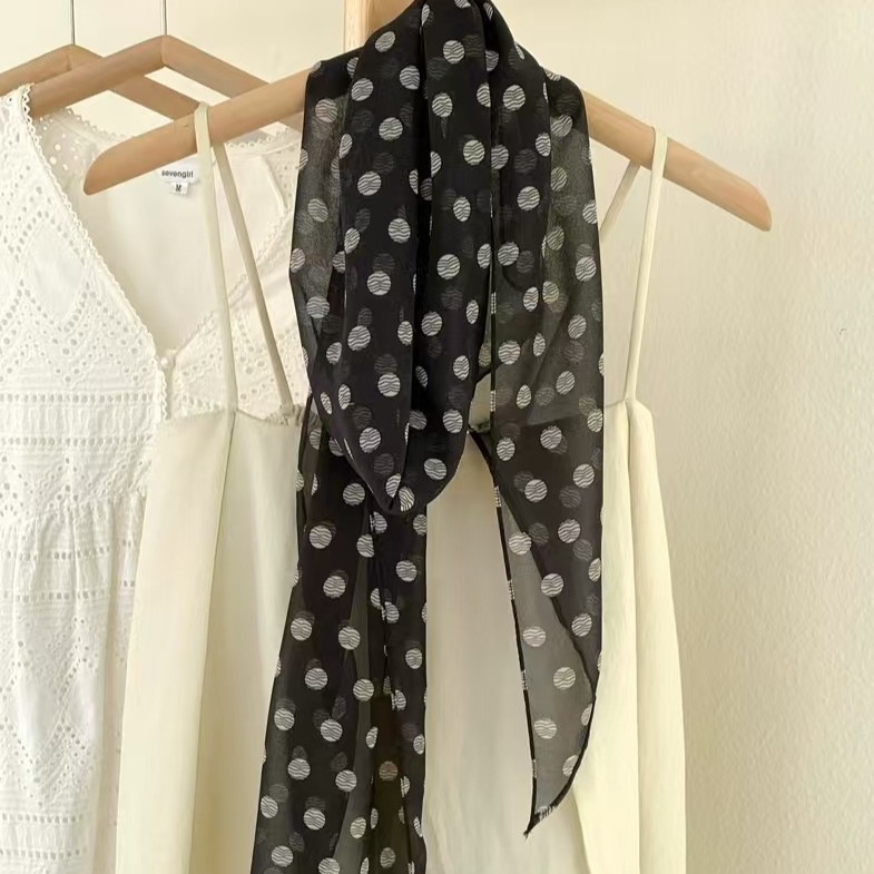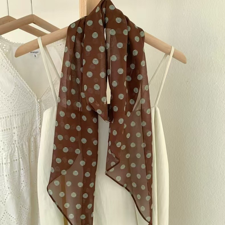 Коричневый шелковый шарф в горошек универсальный аксессуар для шеи лента женская 2025 новый ободок для волос сумка бант