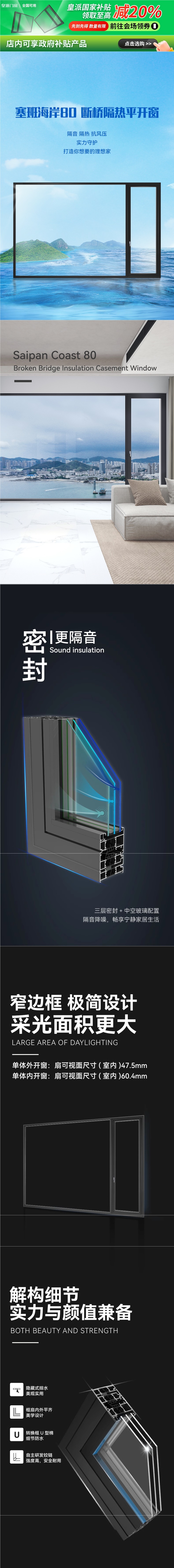 Двери и окна из алюминия с нарушенным мостом, балконные окна в пол, шумоизоляционные стеклянные окна, изолированные алюминиевые оконные рамы Saipan Coast 80
