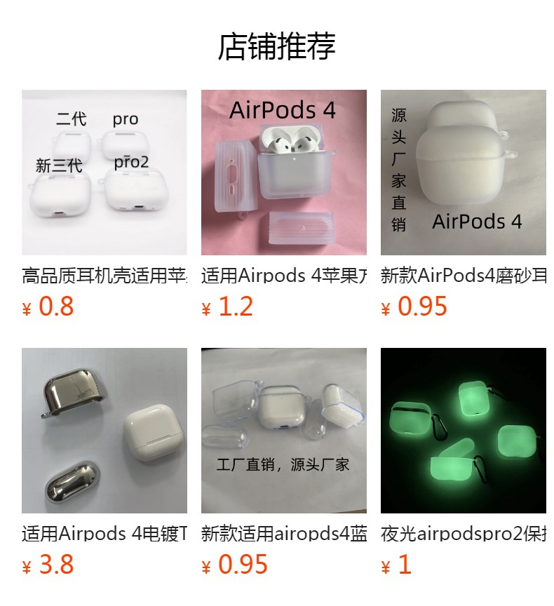 ![]() | Glossy and transparent | Airpods pro | 100шт: ¥0.80, 5000шт: ¥0.75, 10000шт: ¥0.70 | 35595 | 6113403331189 | |