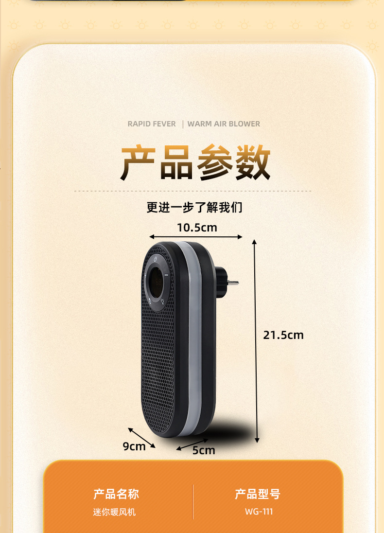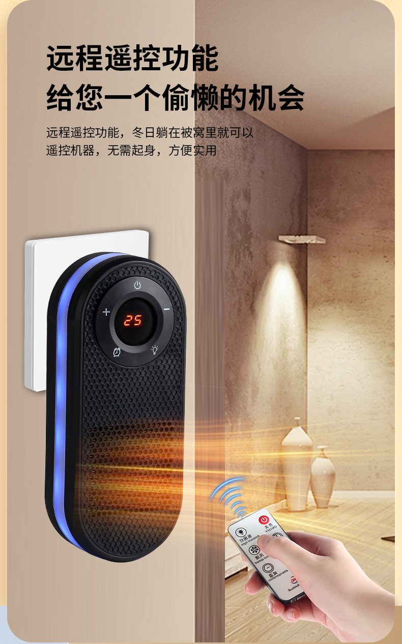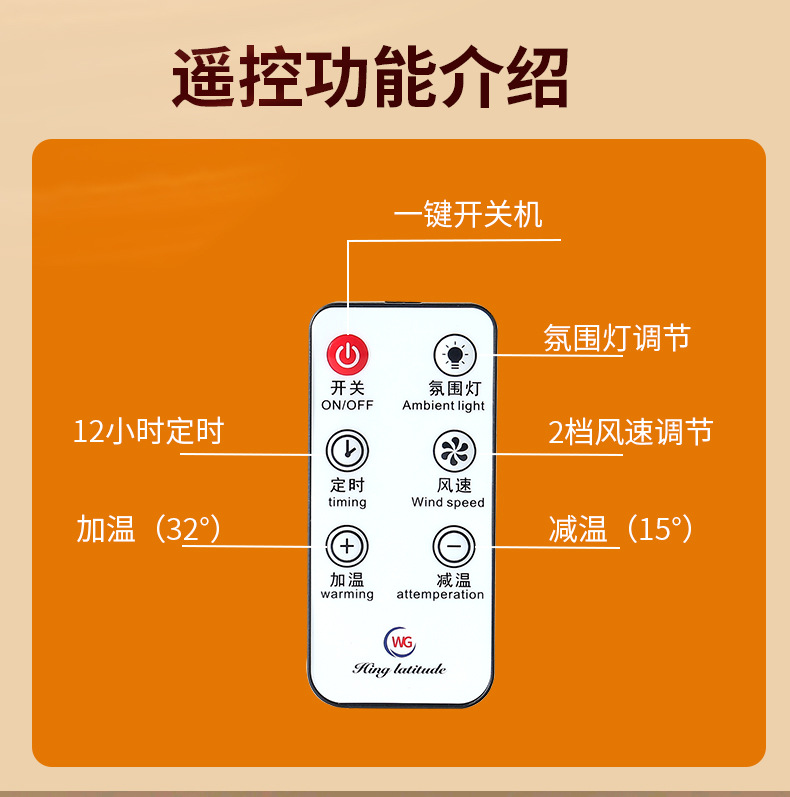 产品参数:定时12小时功能 氛围七彩灯 高低档 插头180度旋转 触摸开关 遥控