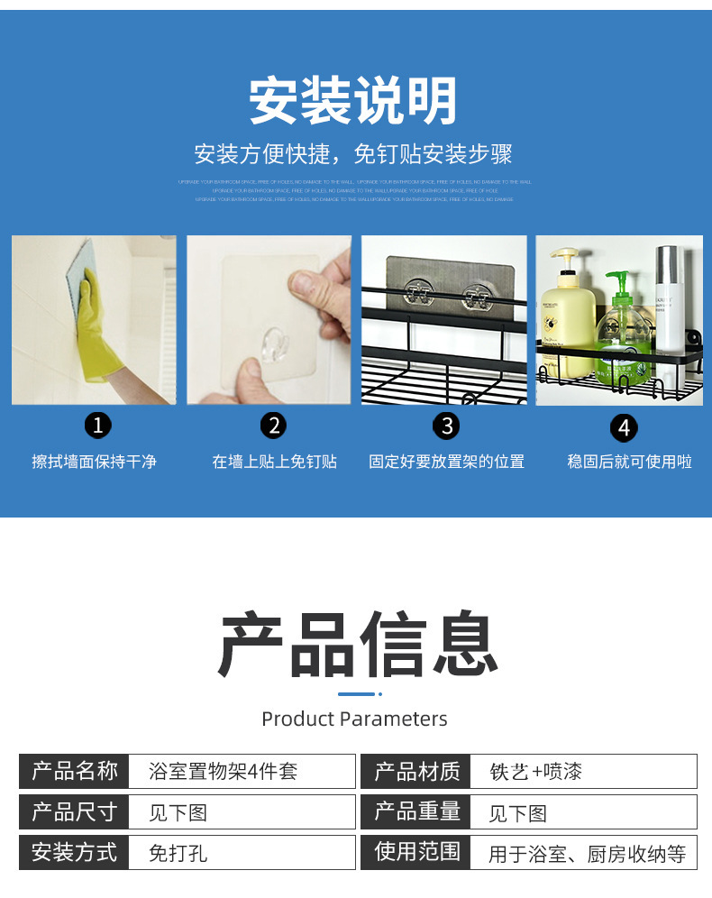 Набор из пяти стеллажей для ванной из кованого железа, без сверления