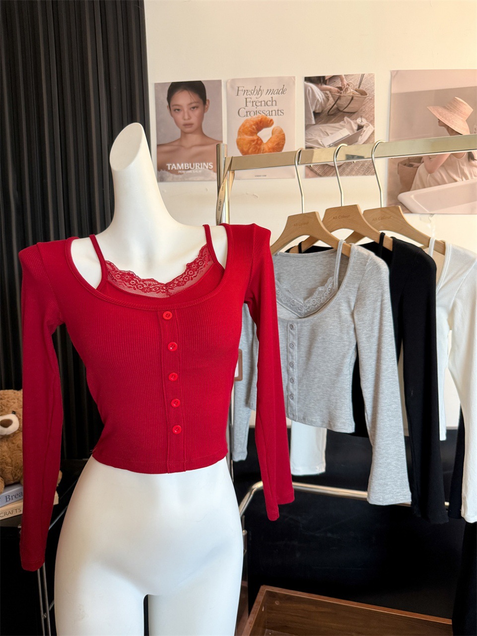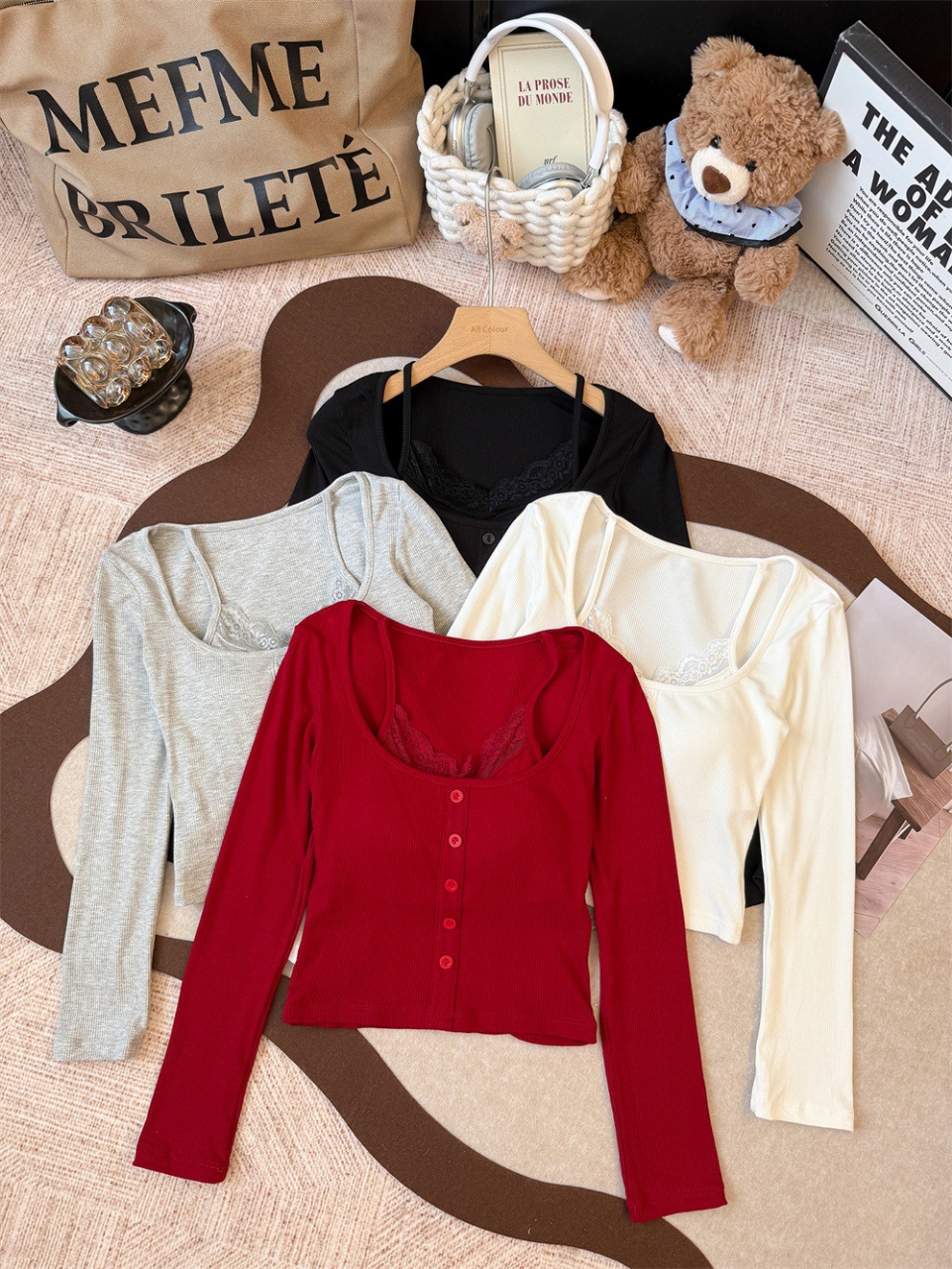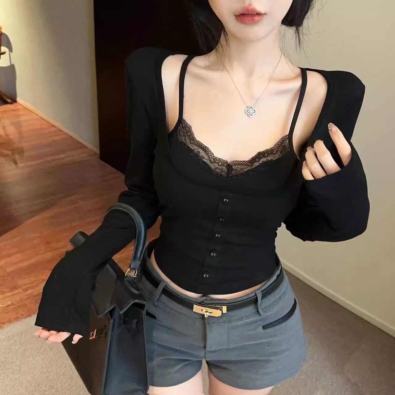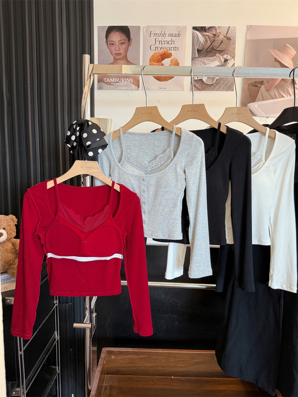 5153 # Pure Desire Горячая девушка кружевное комбинированное фальшивое двукомпонентное длинное рукавное футболка осень Slim Fit внутренняя короткая базовая футболка