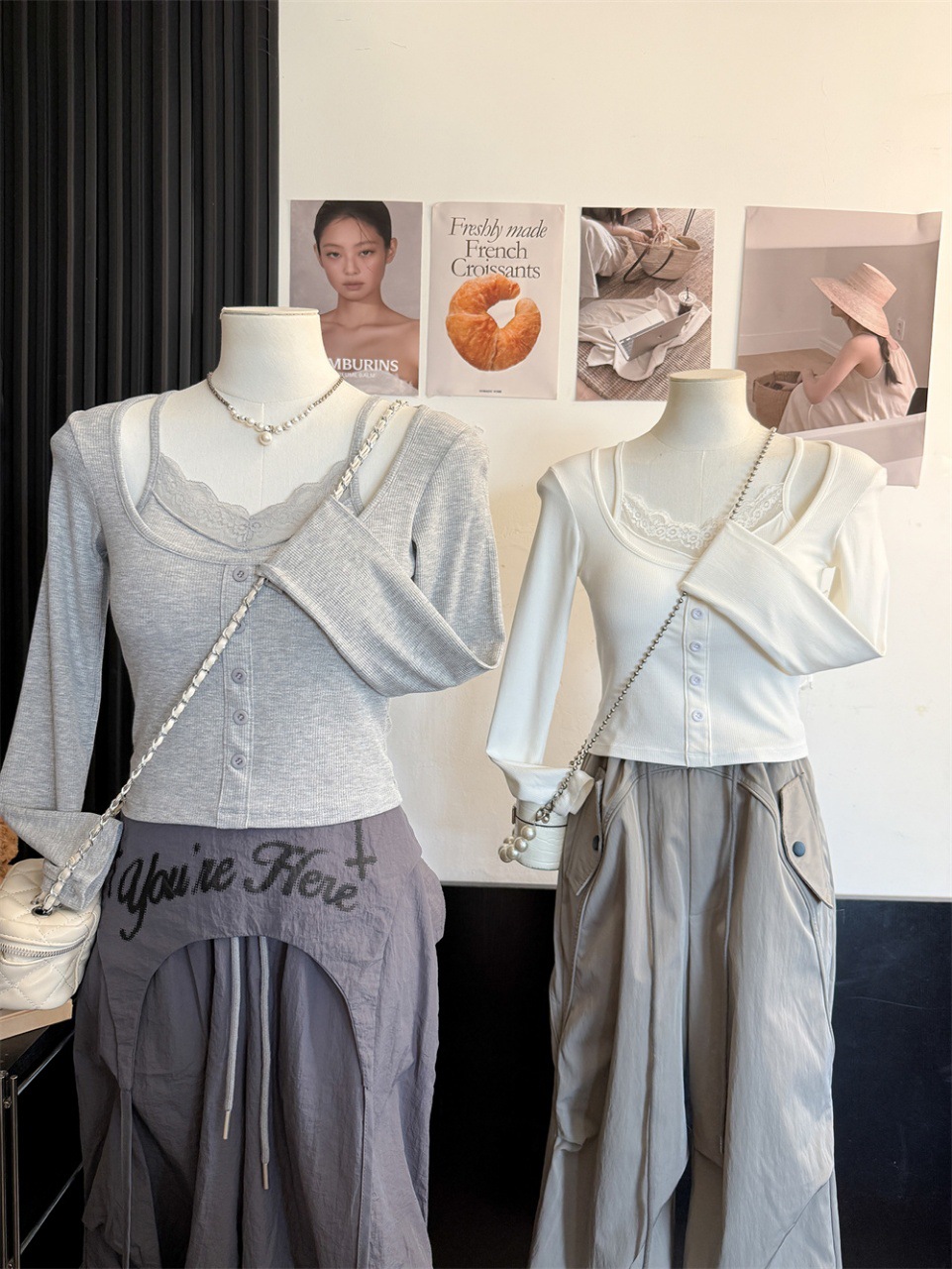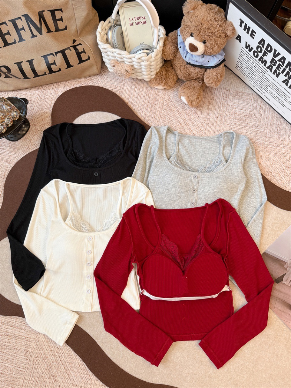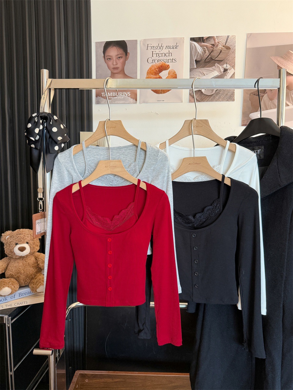 5153 # Pure Desire Горячая девушка кружевное комбинированное фальшивое двукомпонентное длинное рукавное футболка осень Slim Fit внутренняя короткая базовая футболка