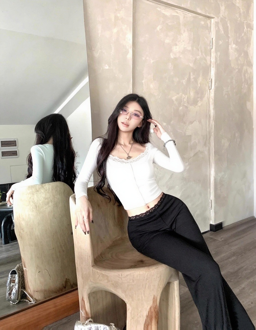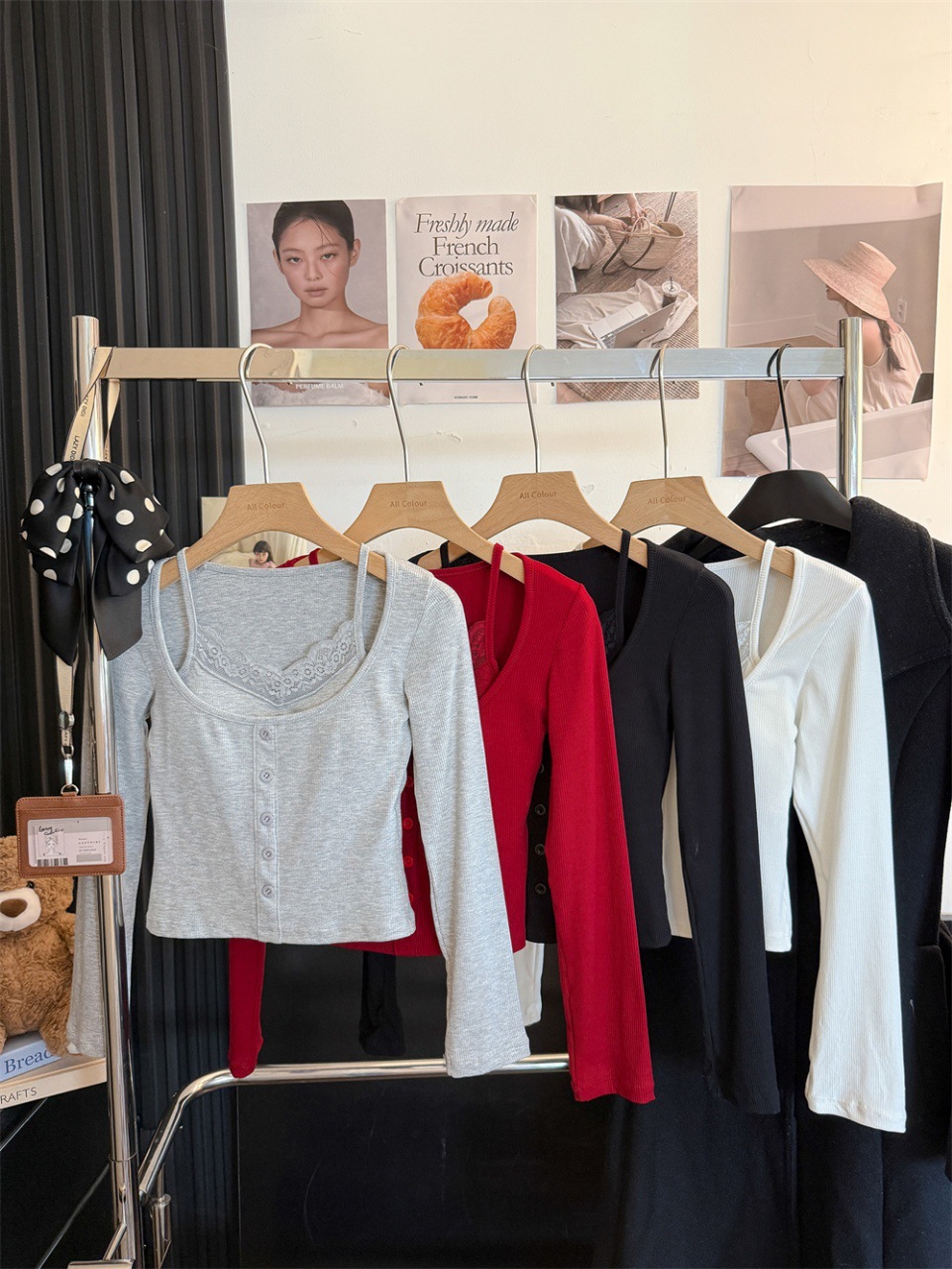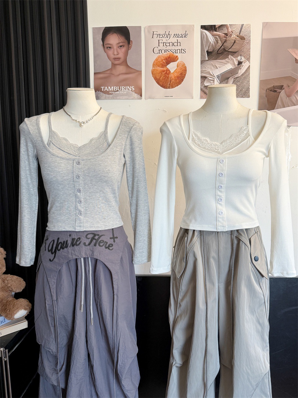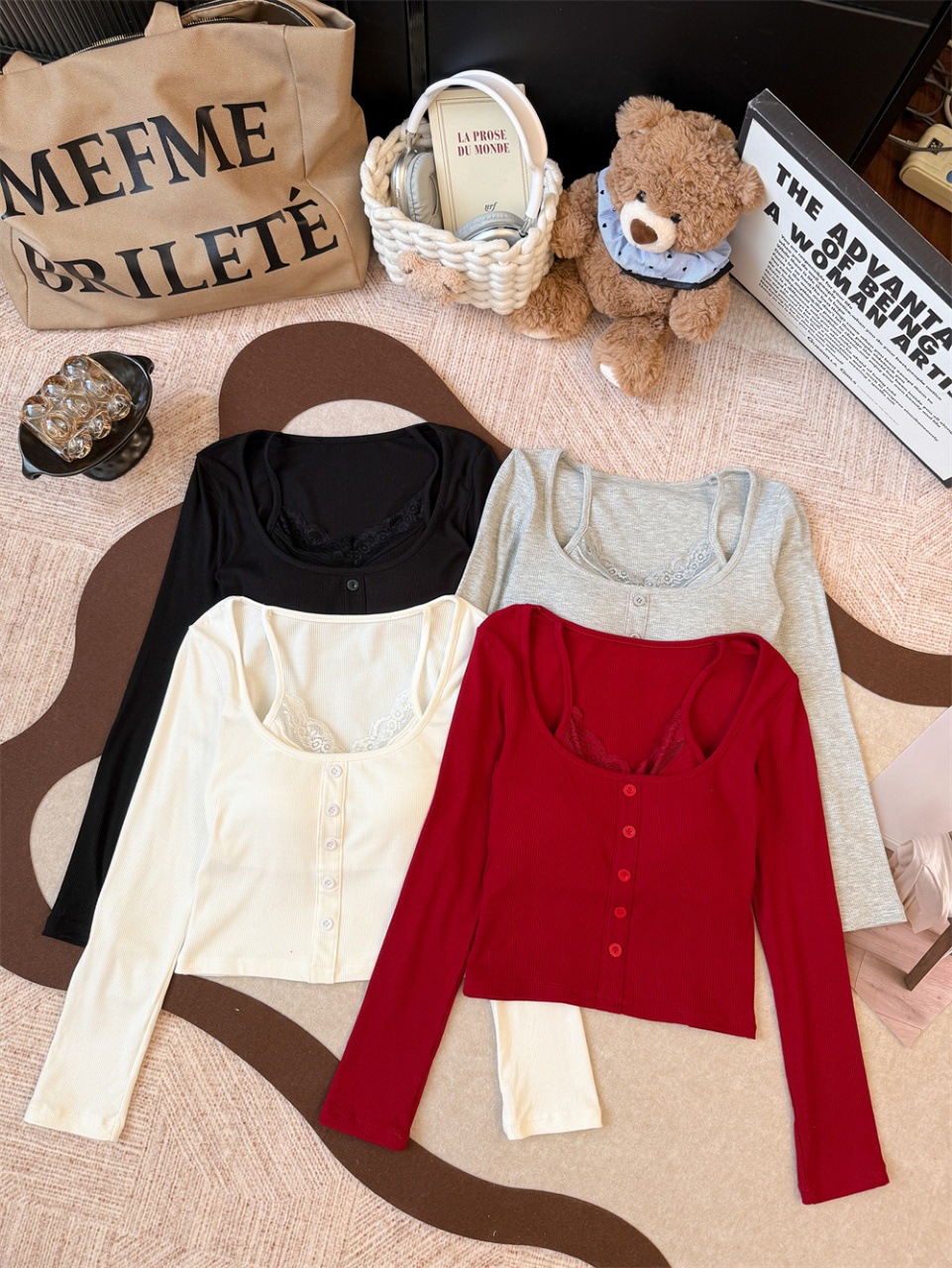 5153 # Pure Desire Горячая девушка кружевное комбинированное фальшивое двукомпонентное длинное рукавное футболка осень Slim Fit внутренняя короткая базовая футболка