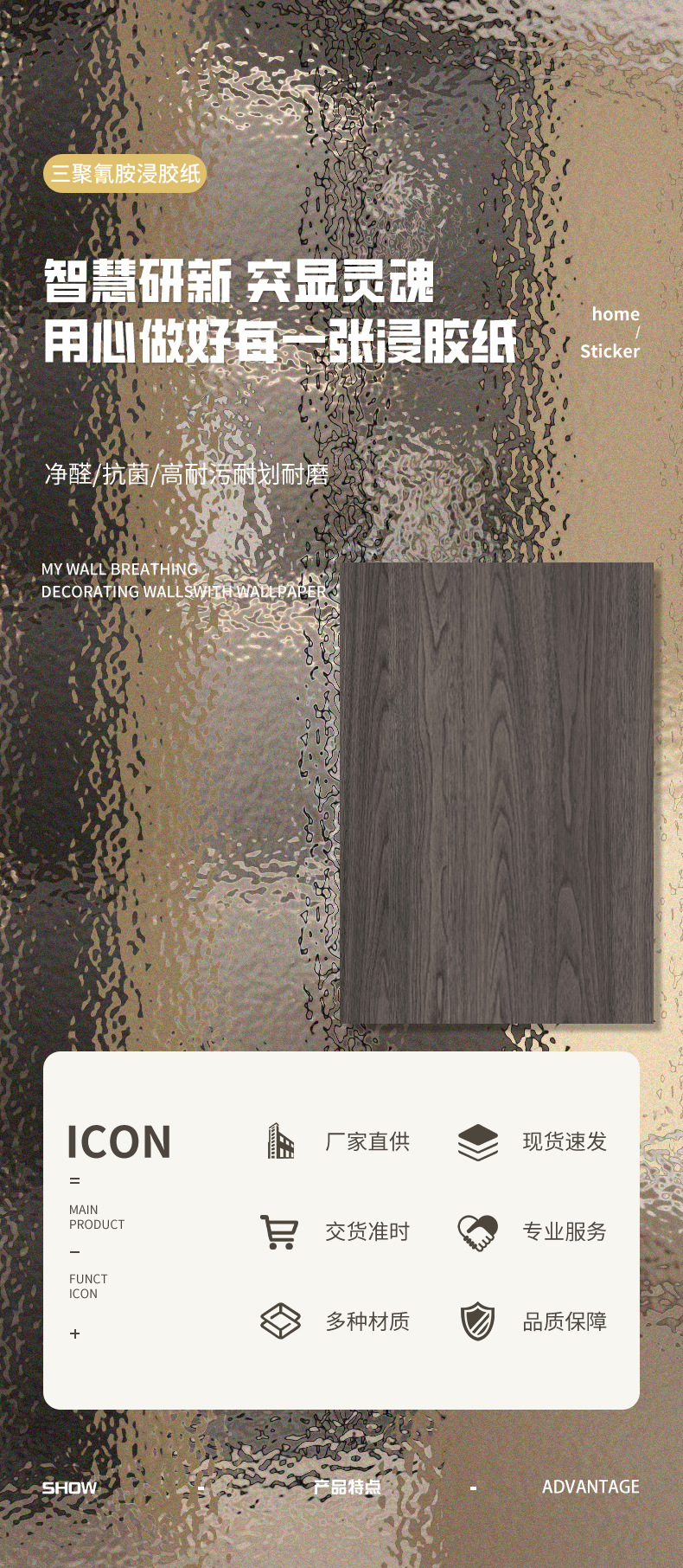 Характеристика Rich colors, strong plasticity, fine texture, uniform texture, multi-functionality: antibacterial and mildew-proof, deodorizing and odor-removing, moisture-proof and insect-proof, low-formaldehyde environmental-friendly, stain-resistant abrasion resistant