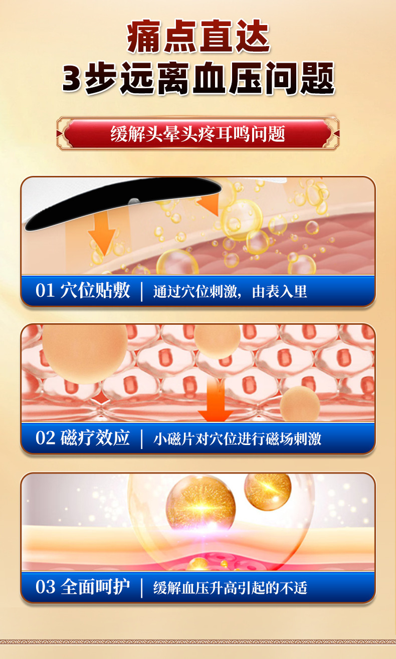 Функция Under the guidance of a doctor's differential diagnosis and acupoint selection, magnetic therapy is applied to acupoints to alleviate headache, dizziness, and tinnitus caused by elevated blood pressure.