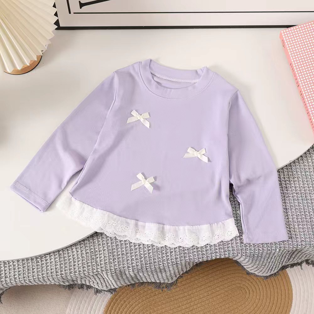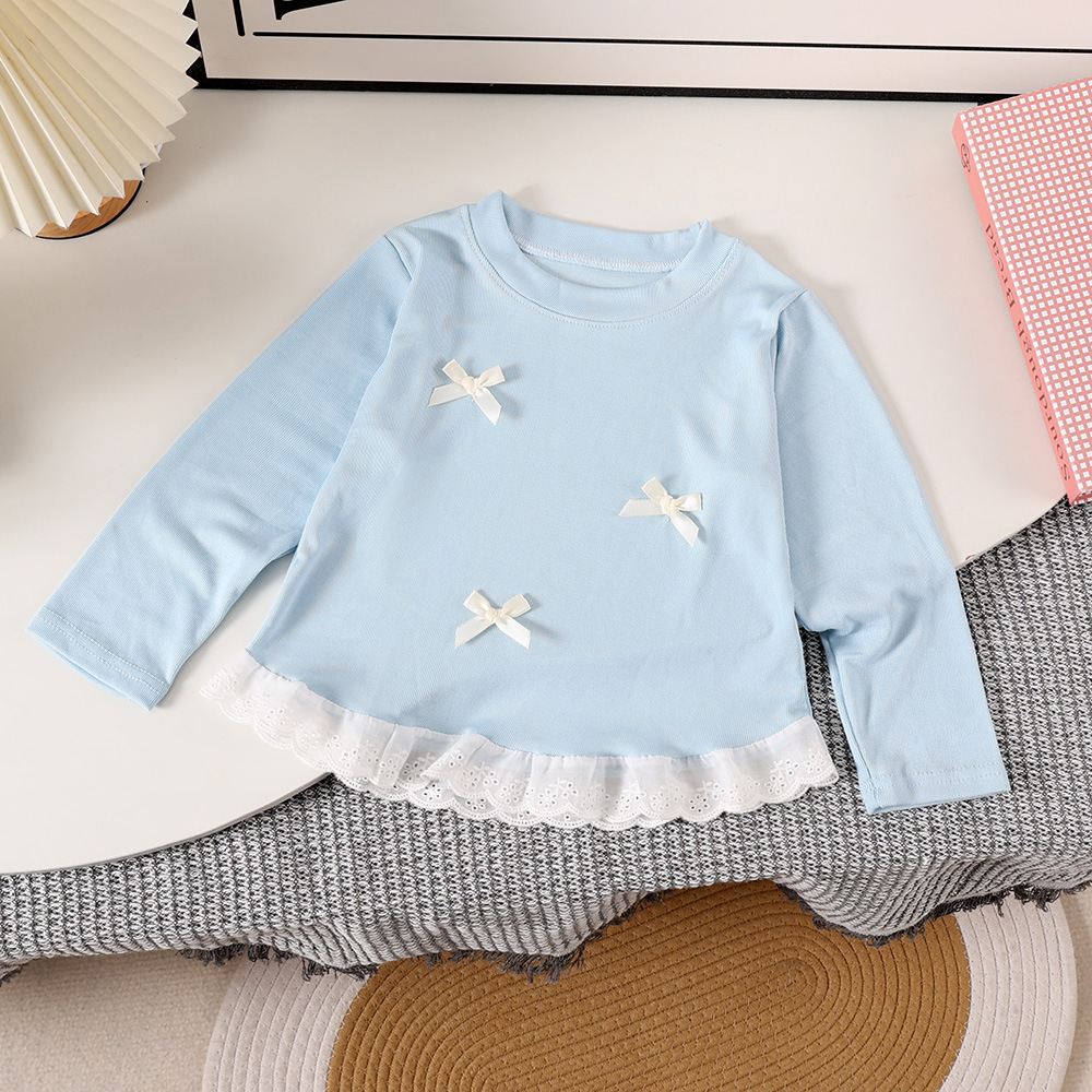 Блузка с бантом и кружевом для девочек, 2025 весна и осень, новый детский верх, корейский стиль, длинный рукав